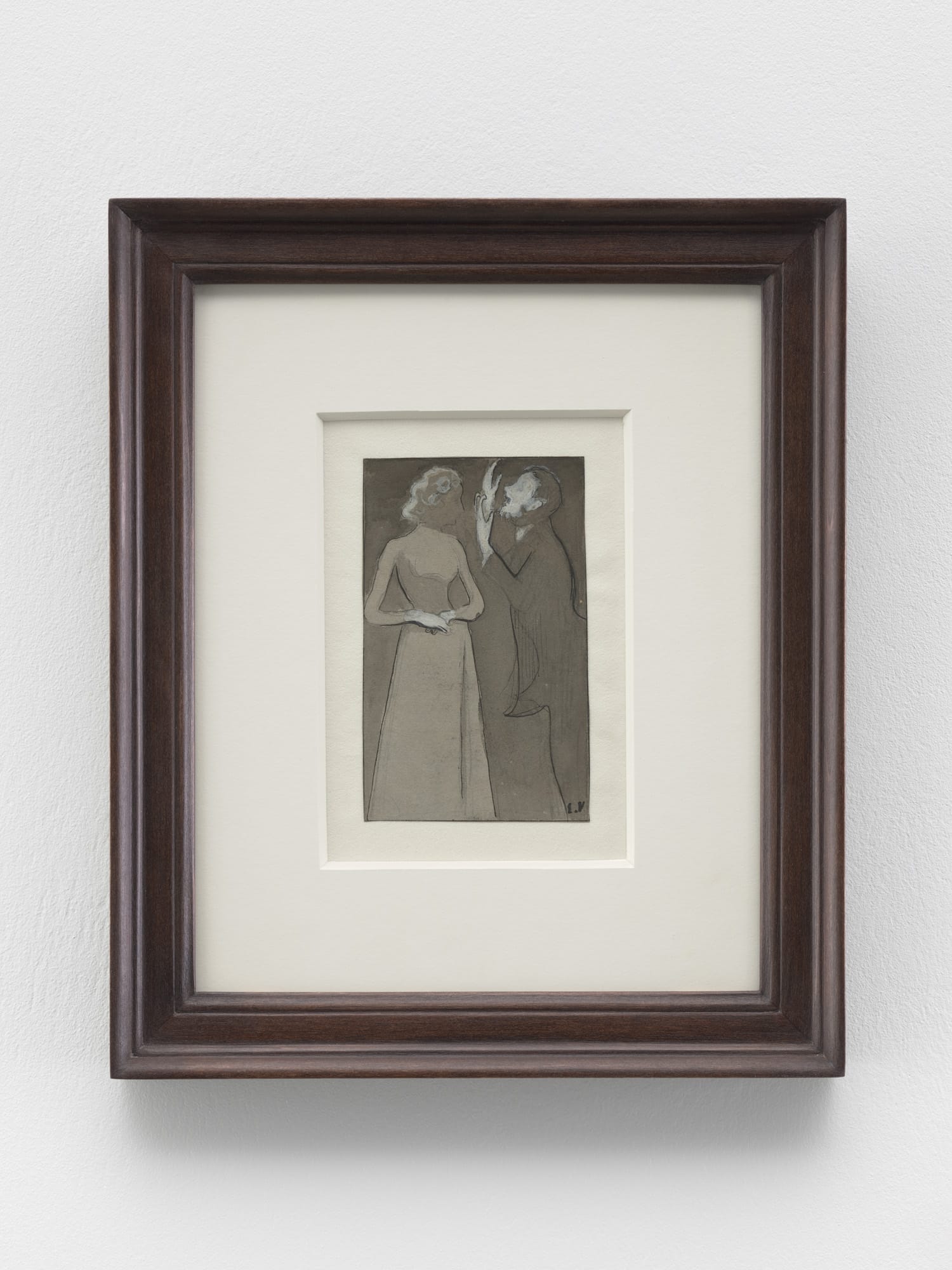 Yet formal affinities are only one level of interaction. A delicate Vuillard ink and gouache drawing, “Deux personnages de théâtre (Berthe Bady et Lugné-Poe)” (“Two Theater Actors (Berthe Bady and Lugné-Poe)),” 1890-1891) portrays the French actors and companions Berthe Bady (1872-1921) and Lugné-Poe (1869-1940) in conversation. Lugné-Poe raises his hands in front of his pale, upturned head, animating his speech, while Bady’s hands are folded, her downcast face veiled by shadows. It is an image about speaking and listening, about performing and visualizing language. In a way, its companion piece in Enter the Mirror is the all-text silkscreen, “Sci-Fi Short Story from 2007.” In Vuillard’s work, the image becomes discursive; in Aldrich’s, the text is aestheticized. In both works, image and language veer ever closer, overlapping, finally collapsing into one another.