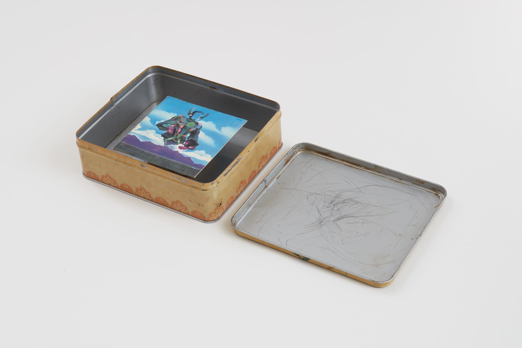 The original portrait sketch of Aldrich served as source material for an earlier painting (“Portrait of Me by Elizabeth Czeckner,” 1998), while the band list is reflected in a nearby 2002 found-object sculpture — an open metal box containing the CD cover of “Monster Movie” (1969) by the German avant-garde rock band Can.