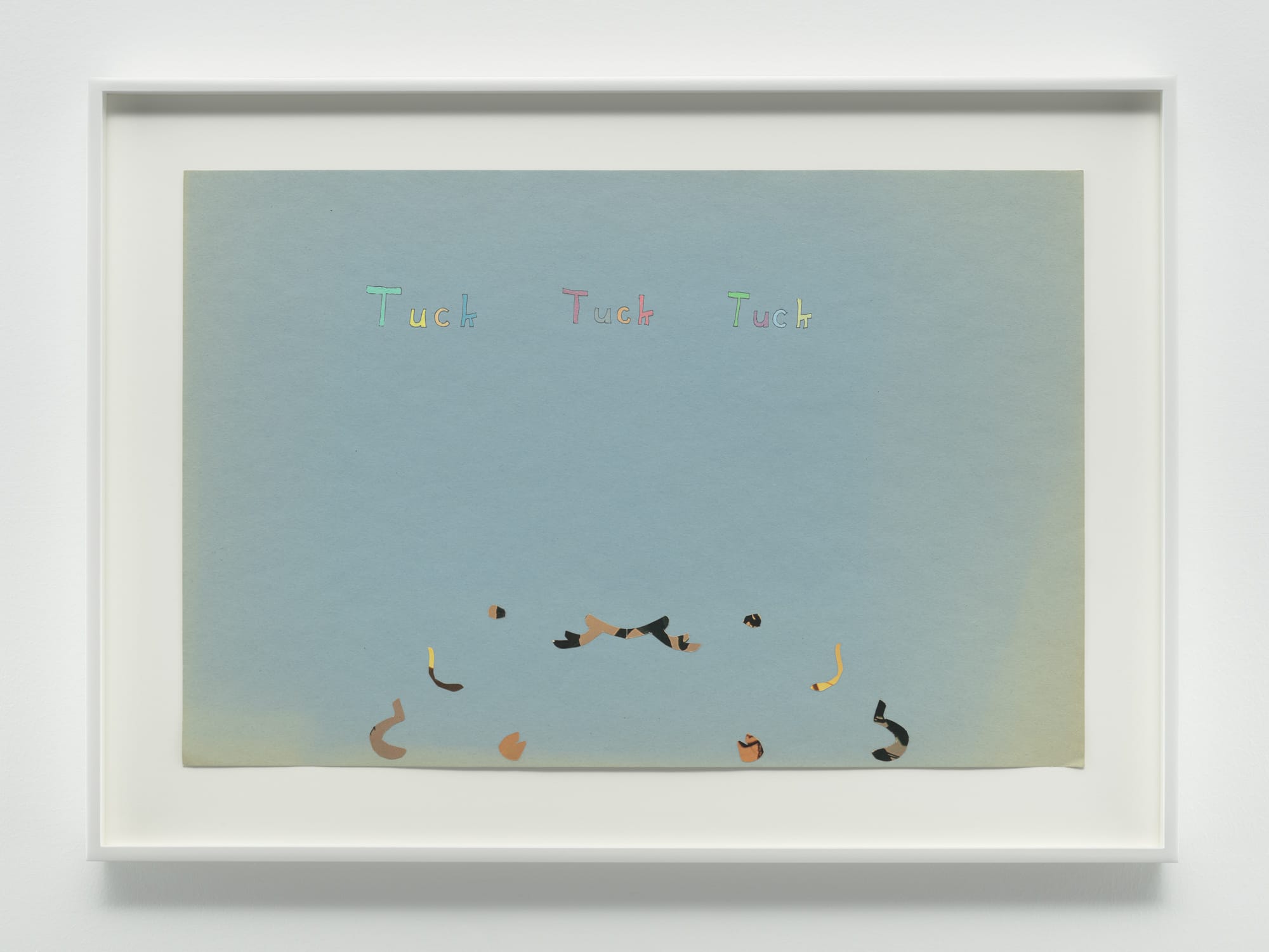 The first is a small collage from 2002, “‘Tuck Tuck Tuck’ with Cut Out Shapes from Time Life Book Series on Blue Construction Paper.” Though the title ostensibly describes the work, it offers little in the way of visualizing the powder blue paper, adorned with squiggly cutouts and the handwritten words, “tuck tuck tuck.” Nor does it explain that “Tuck Tuck Tuck” refers to Aldrich’s solo music project from 1999 to 2001 and the subsequent related publication, The Words of Tuck Tuck Tuck (Karma, 2012).