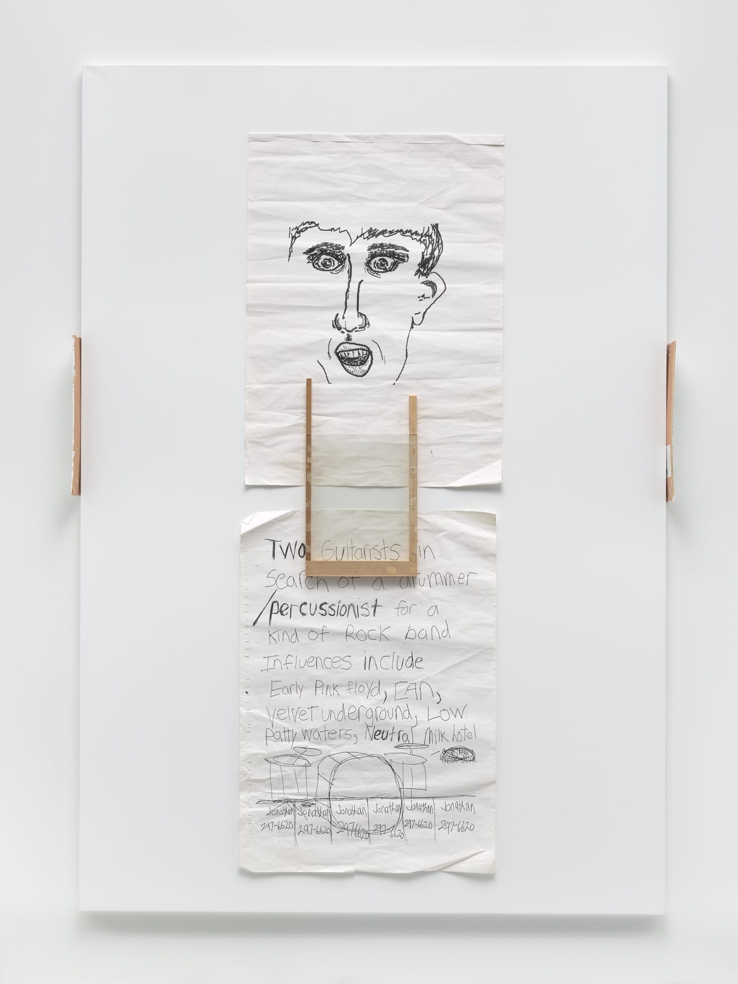 Elliptical interactions are key to Aldrich’s approach to image- and meaning-making. “In Search Of …” (2017/2012, 2010, 2000) features a re-creation of a portrait sketch of the artist made by an ex-girlfriend above a hand-written classified ad for a “drummer/percussionist for a kind of rock band,” whose influences include early Pink Floyd, Can, Velvet Underground, Low, Patty Waters, and Neutral Milk Hotel.
