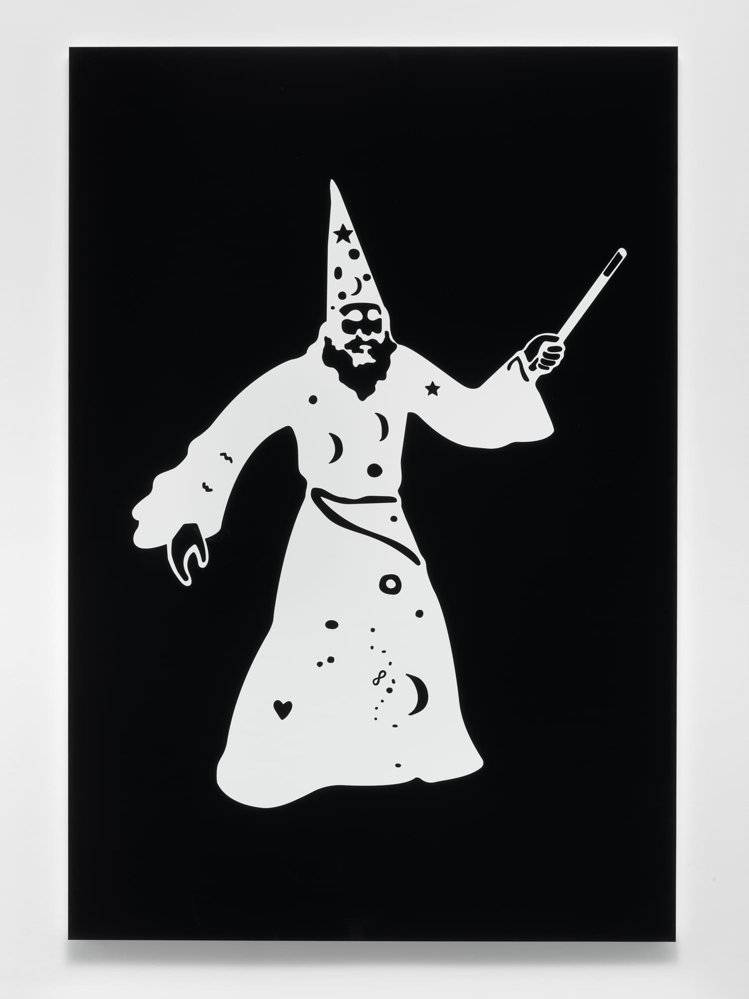 He initiates a significantly more layered (and potentially problematic) chain of associations with the 72 by 49-inch silkscreen “Wizard” (2015-2018). The flatly rendered white-on-black robed wizard, complete with wand and pointed hat, reflects the triangular peaks in two similarly sized untitled abstract paintings in the exhibition. “Wizard”’s straightforward figuration coaxes out the figurative leanings of Aldrich abstractions and calls forth varied interpretations. Given Aldrich’s interests, as evidenced in past works such as “Hobbit Painting” (2006-2008), a wizard could be a detour into Tolkien’s lore. In the United States, however, the notion of a “white wizard” is inextricable from a shameful history of bigotry and murder. Whatever the artist’s intention, this level of meaning casts a shadow across Middle Earth.