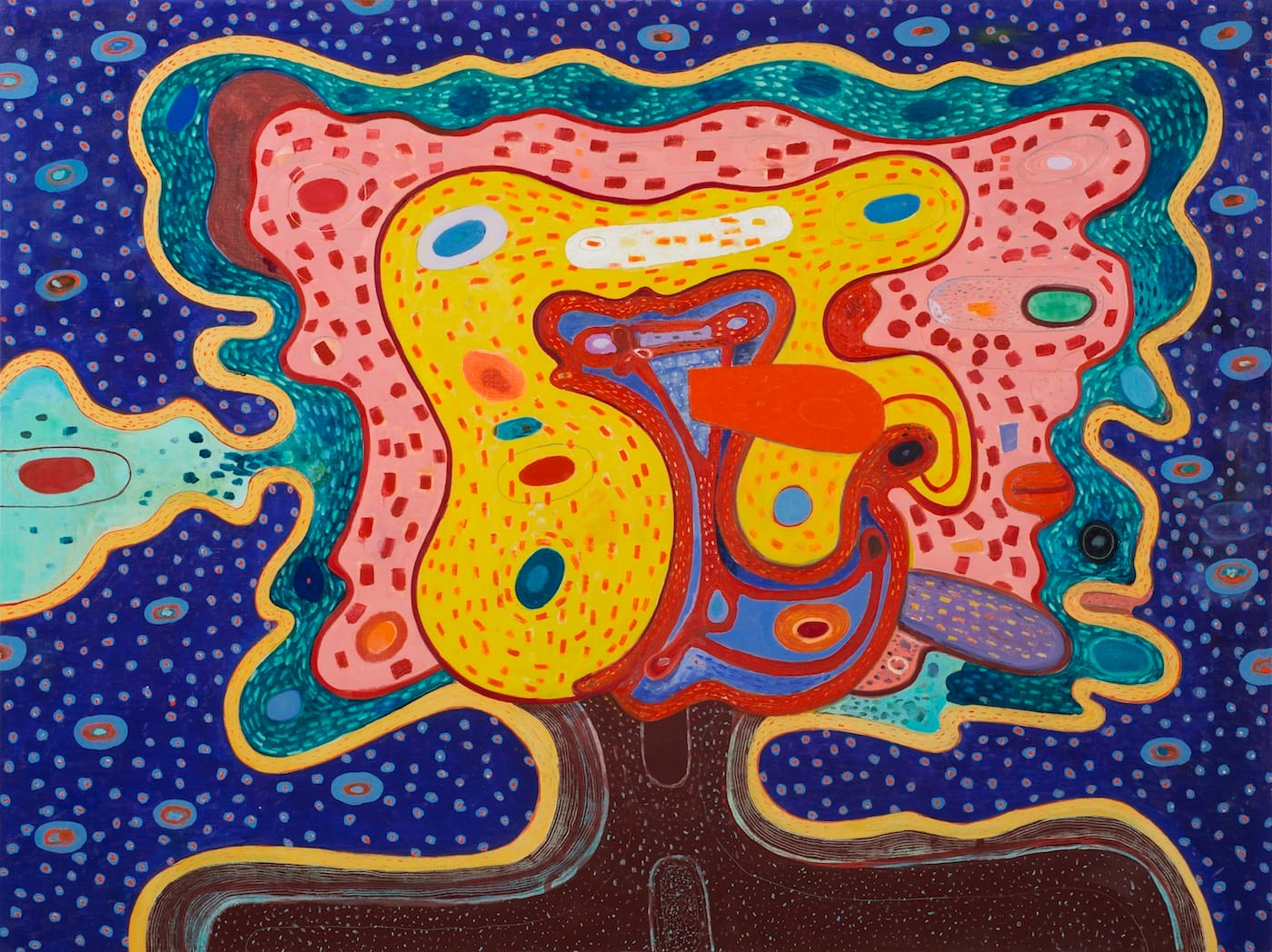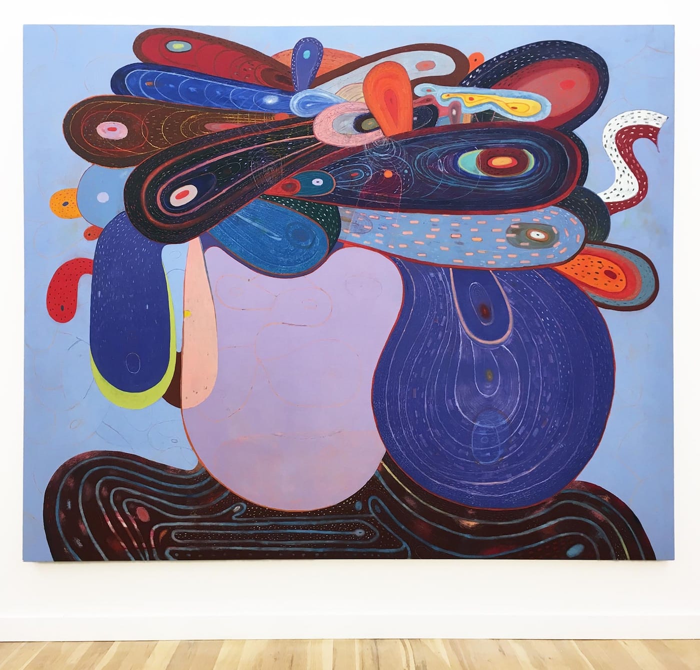 The idea for the heads came from a game of exquisite corpse that Hull played with two friends, the saxophonist and composer Ken Vandermark and the illustrator and printmaker Dan Grzeca. Hull drew a horse’s rump with a looping tail, which became a profusion of petal-like shapes activated by concentric lines and dashes. He carried this profusion of shapes into his paintings, where a cell-like structure, complete with nucleus, can be found in many of the petals. The cells can look like eyes, all of which seem to be staring at you blankly. Other times the petals resemble the tongues of panting dogs, whirlpools of paint, a multitude of large ears, the leather plates and scales of samurai armor, or parts of unidentifiable and possibly dangerous plants. This dense bouquet of colored shapes is balanced on top of a neck and shoulders (or is it the top of a jug?) rising up from the painting’s bottom edge.