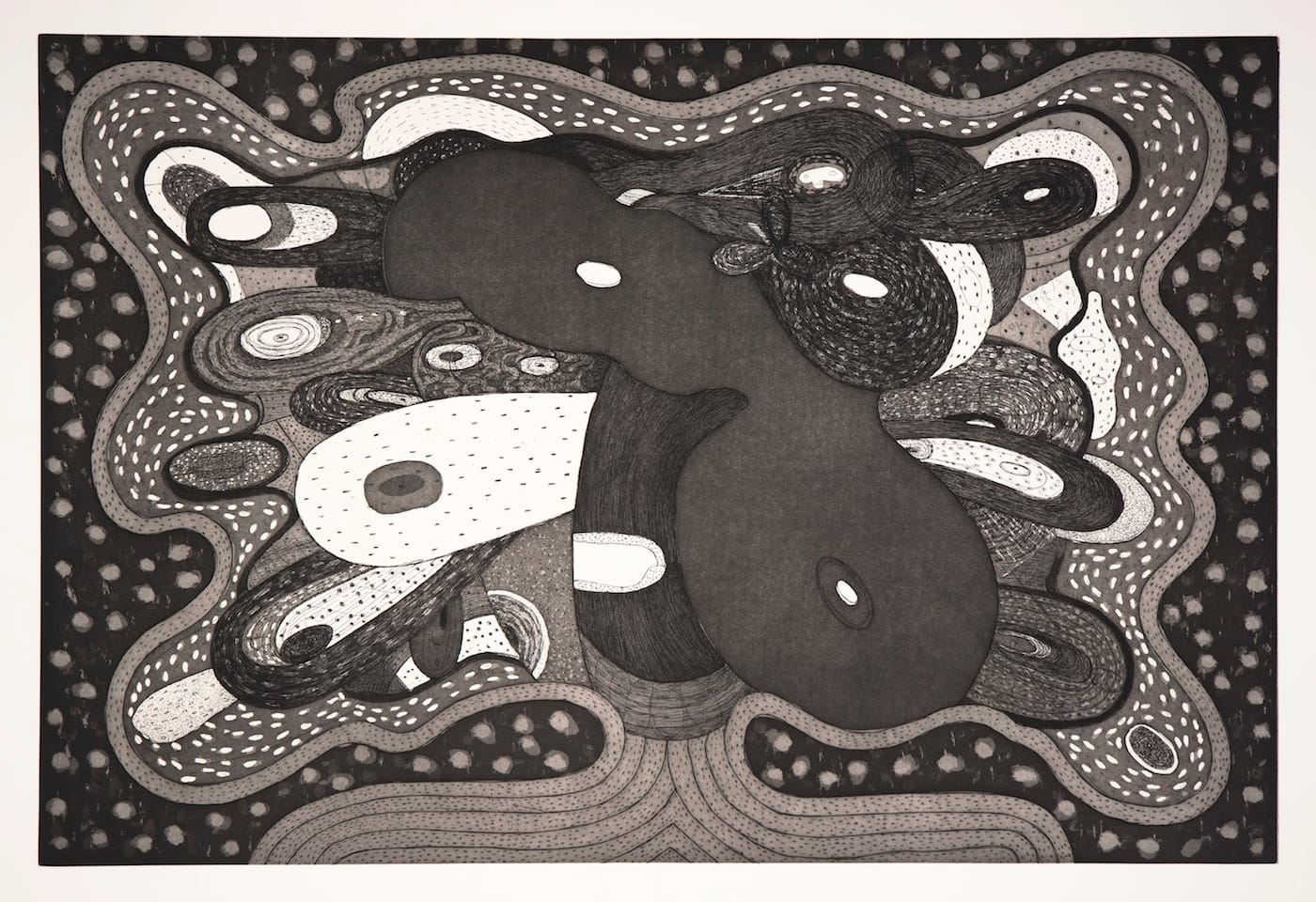 The bulbous forms in Hull’s “stolen portraits” are funny, weird, seductive, robust, mysterious, saucy, and nearly impossible to decipher. That resistance to readability is key to what separates Hull from his more figuratively inclined forebears. Hull readily acknowledges his love for the Chicago Imagists, but that does not mean he is derivative.
