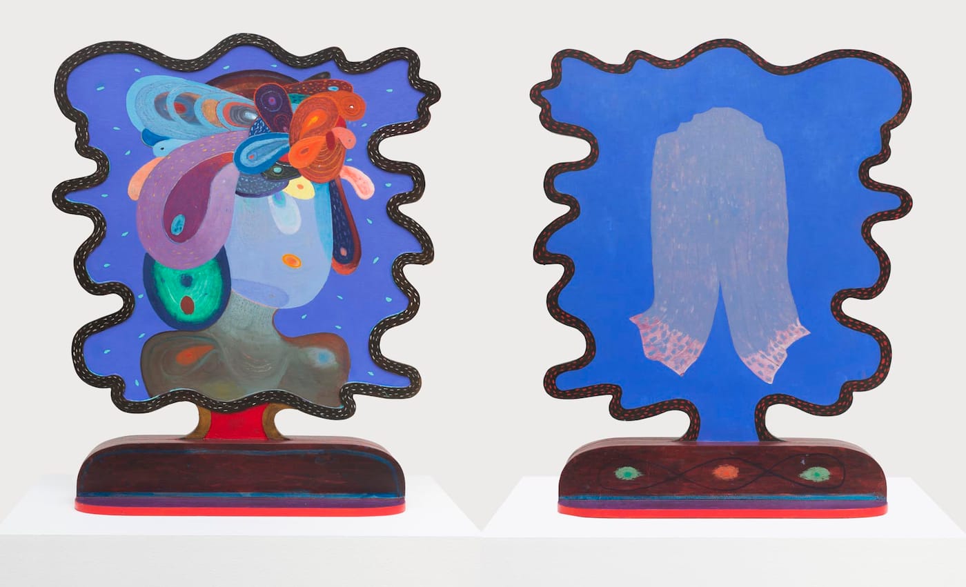 The sculptures are made of MDF fiberboard, an industrial product that is denser and stronger than plywood. Their shapes resemble an explosion or cartoon splatter. They are edged with narrow, painted frames that conform to the contours of the exploding shape. They rise out of a base like heads on a neck, so that the base reads as shoulders. And yet, even as Hull courts this figurative reading while making a nod to vanity mirrors, the blooms of petal-like forms painted on both sides push towards abstraction.