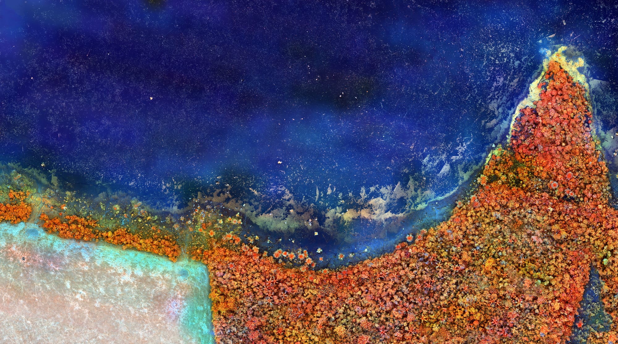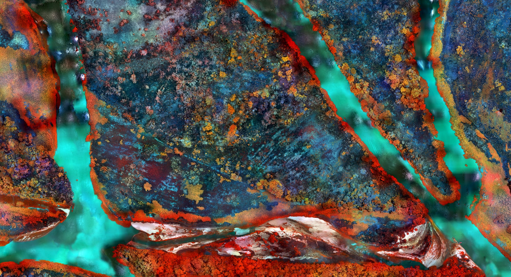 Employing drones, Mosse creates psychedelic aerial maps of ecological degradation.