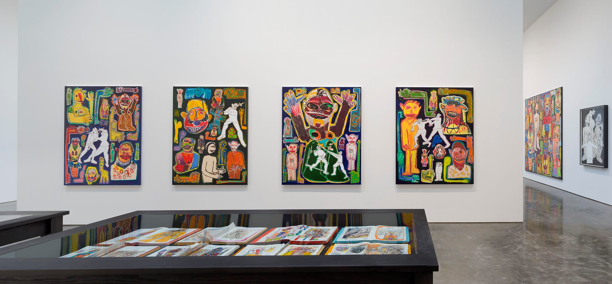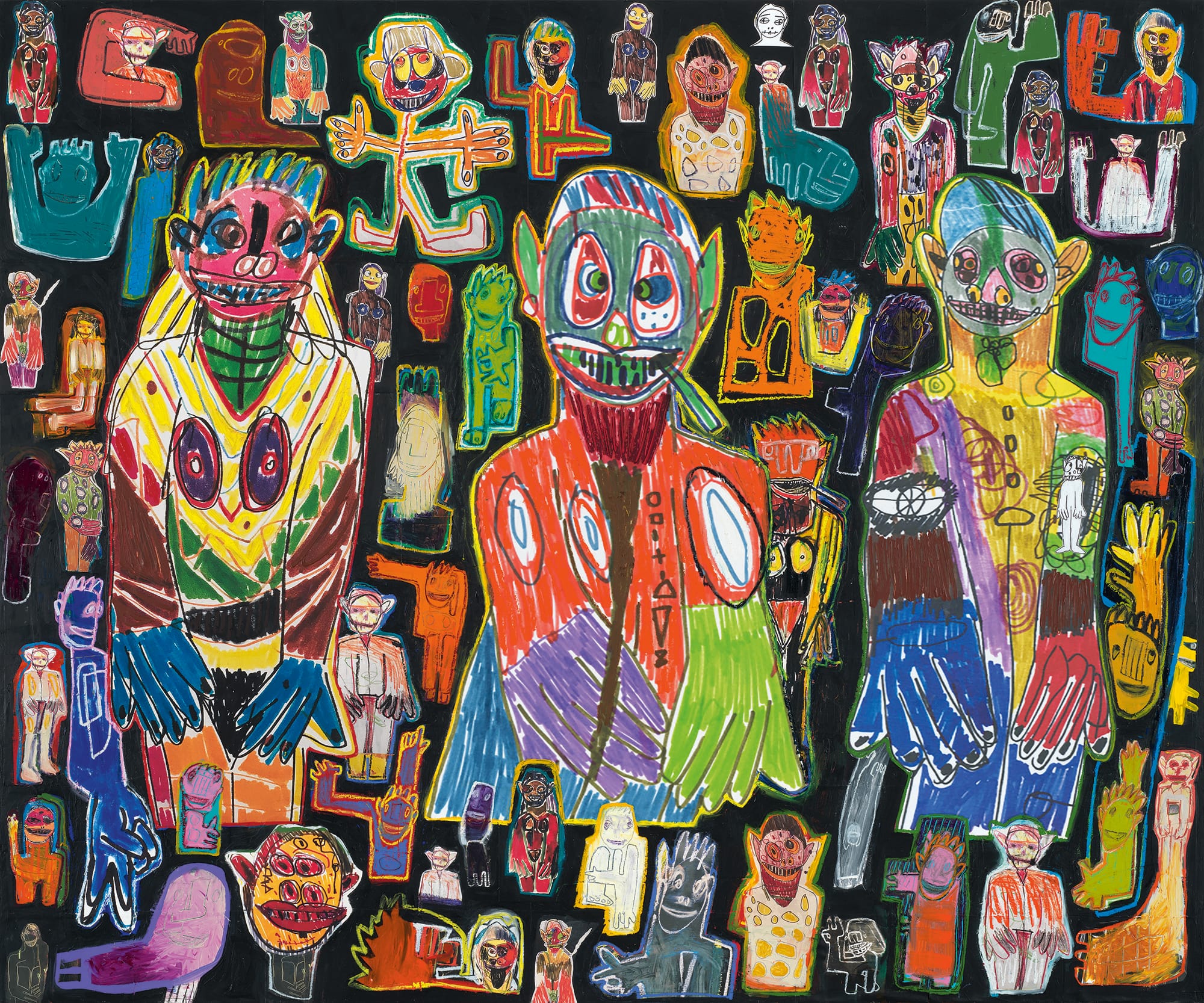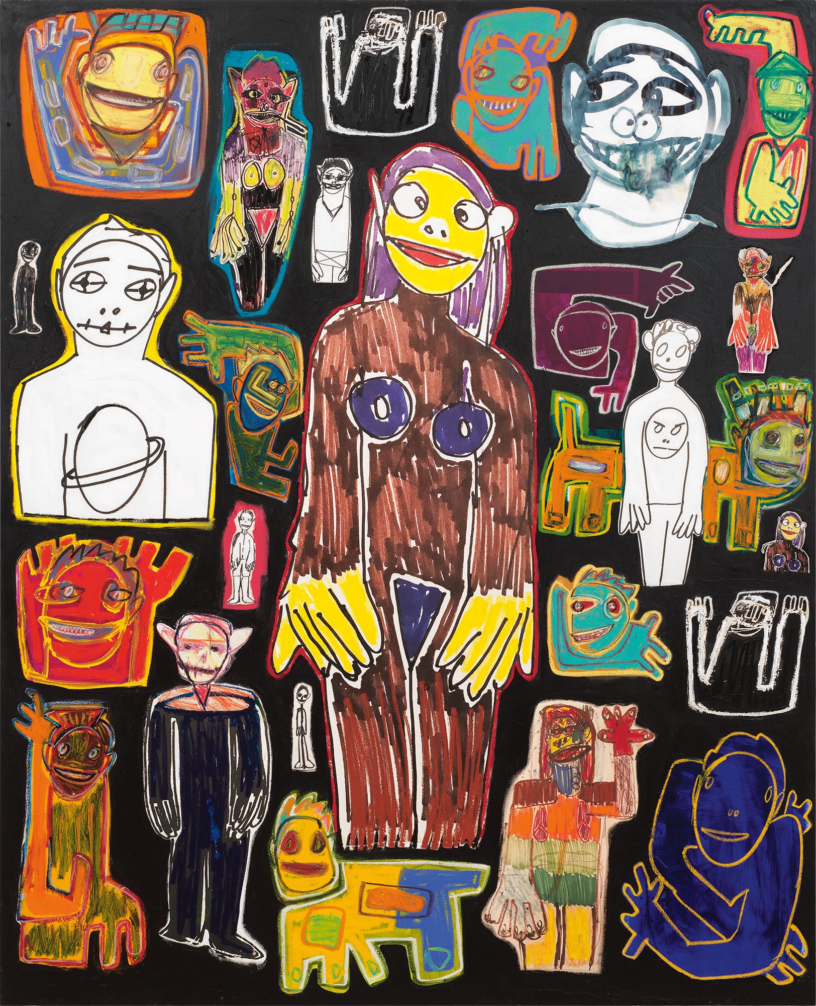 Prince uses an ink jet printer or similar mechanical device to make enlarged versions of these drawings, which are affixed to the stretched canvas surface. The arrangement of the figures is always tasteful, with a large figure or face centrally placed or, in some works, three large figures evenly spaced across the surface. The images surrounding them are separated by black paint, preventing the work from feeling too crowded or difficult to read. When Prince overlays one image on another, he makes sure the contrast is graphically obvious — an outlined white figure on top of a multicolored one. These are easy-to-look-at works, which hardly seems the case of the best works by Dubuffet or Basquiat, which demand the viewer scrutinize, unravel, and even read. There is nothing vigorous about Prince’s drawings: all the lines seemed to be made with same calculated cool.