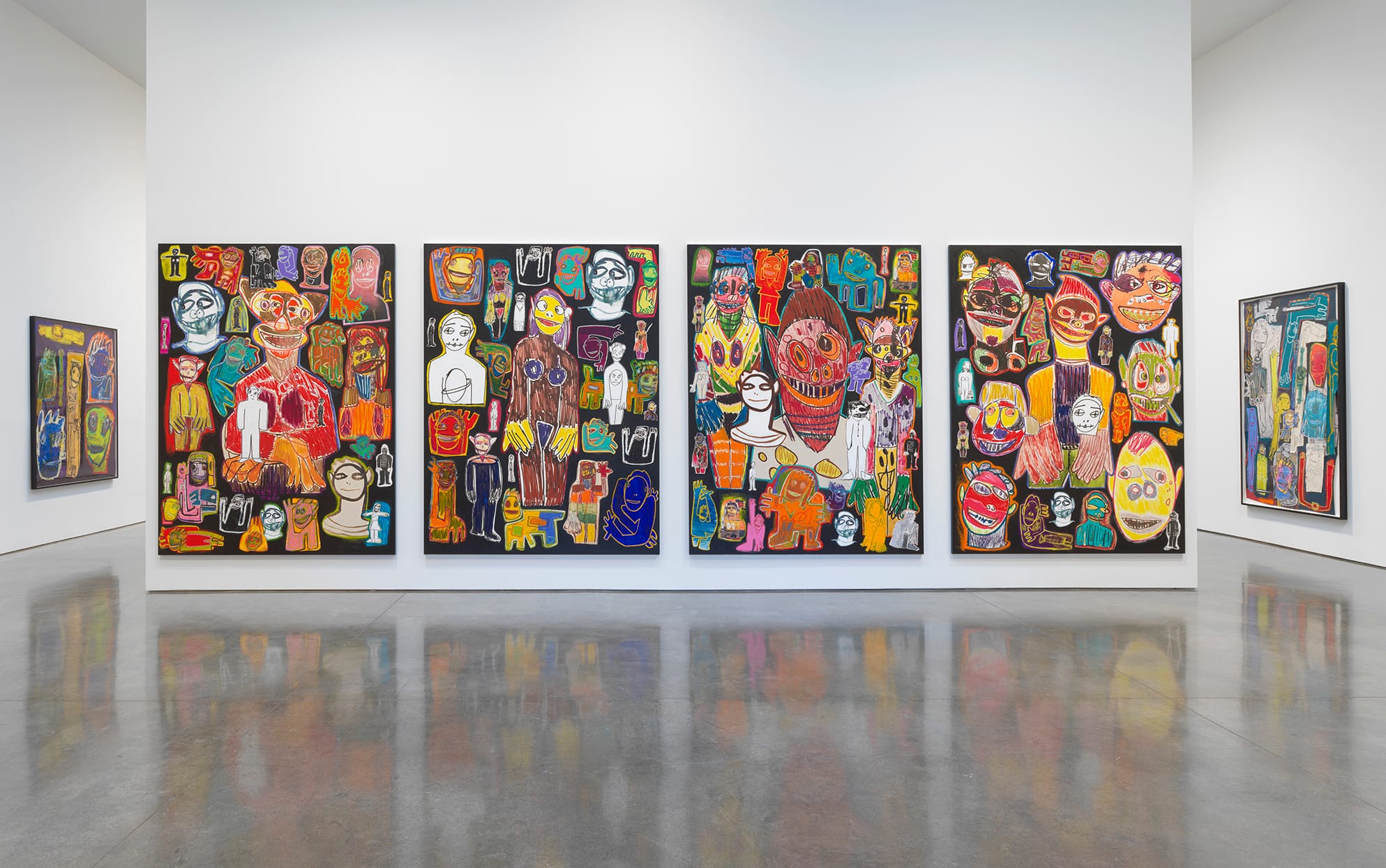 During the last decade, Nicole Eisenman, Dana Schutz, and Amy Sillman have been painting faces and bodies engaged in all kinds of gross, funny, weird, and ordinary things: sneezing, yawning, staring into a cellphone or at a vinyl record at a crowded party. Eisenman has done paintings of angry white men. She has painted faces that are green and putrid, as if they have come back from the dead. She is unabashed in her allusions to Philip Guston and James Ensor. Prince seems to be trying to channel that work and that sharp, excessive energy. The problem is that he is not a painter, but some kind of sad vampire. He uses paint and color, but he is not very good with either. He cannot get to the real thing, so he comes up with hollow signs for it. In his decades-long attempt to play the sophisticated vulgarian, Prince has finally come up with something all his own: Multicolored Prozac Expressionism.
