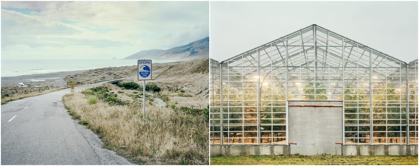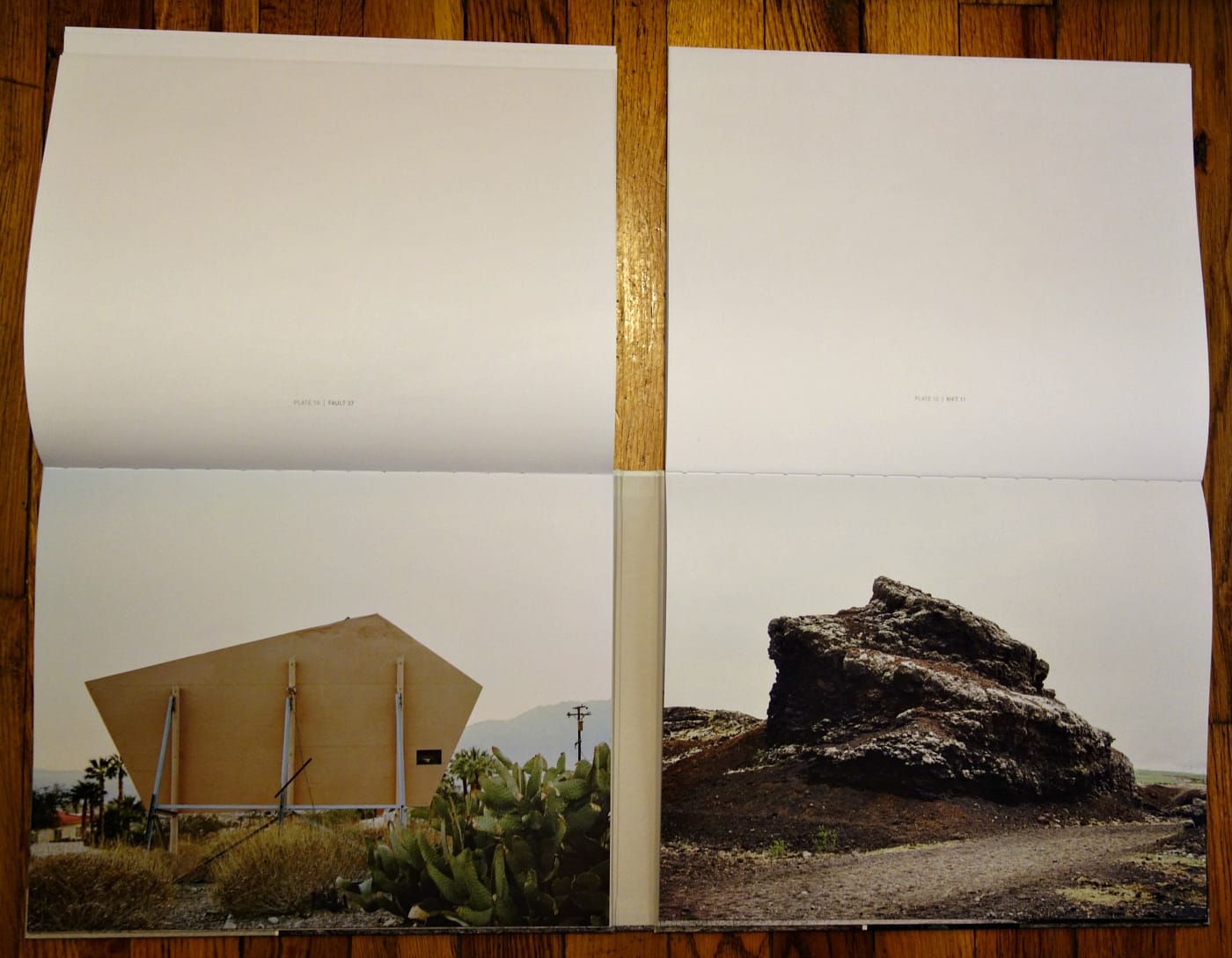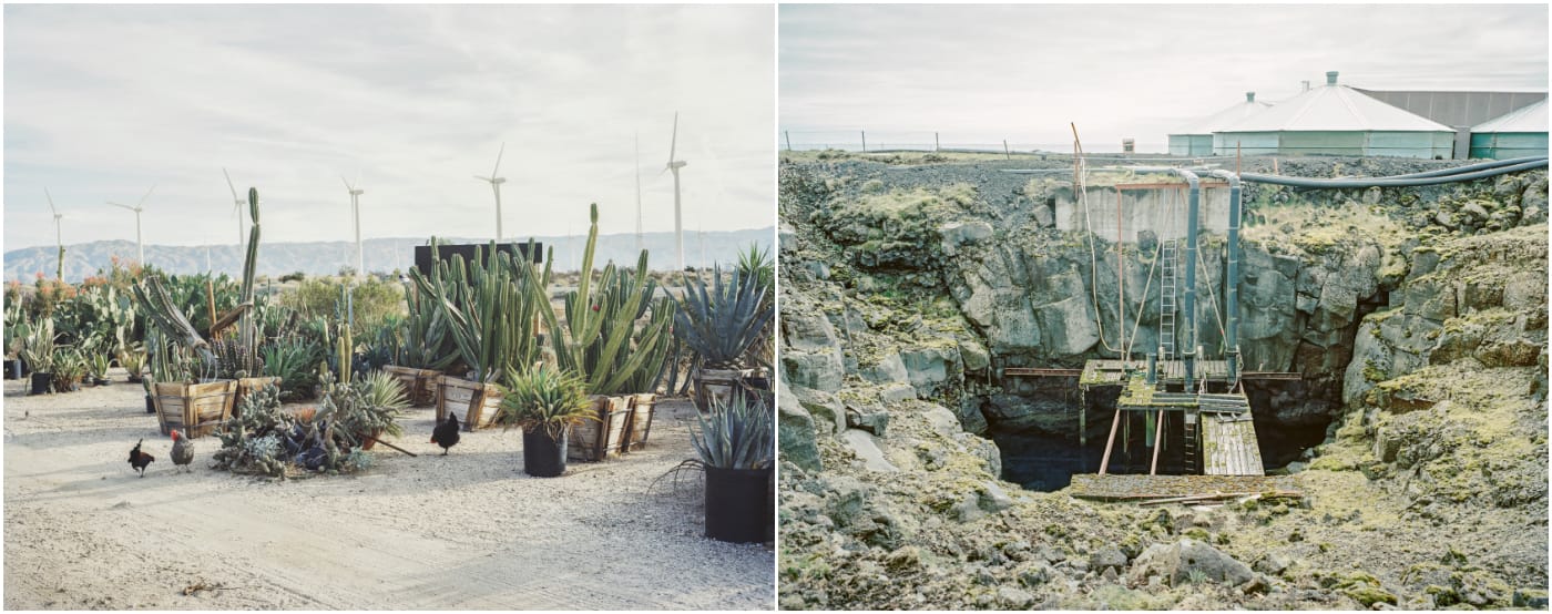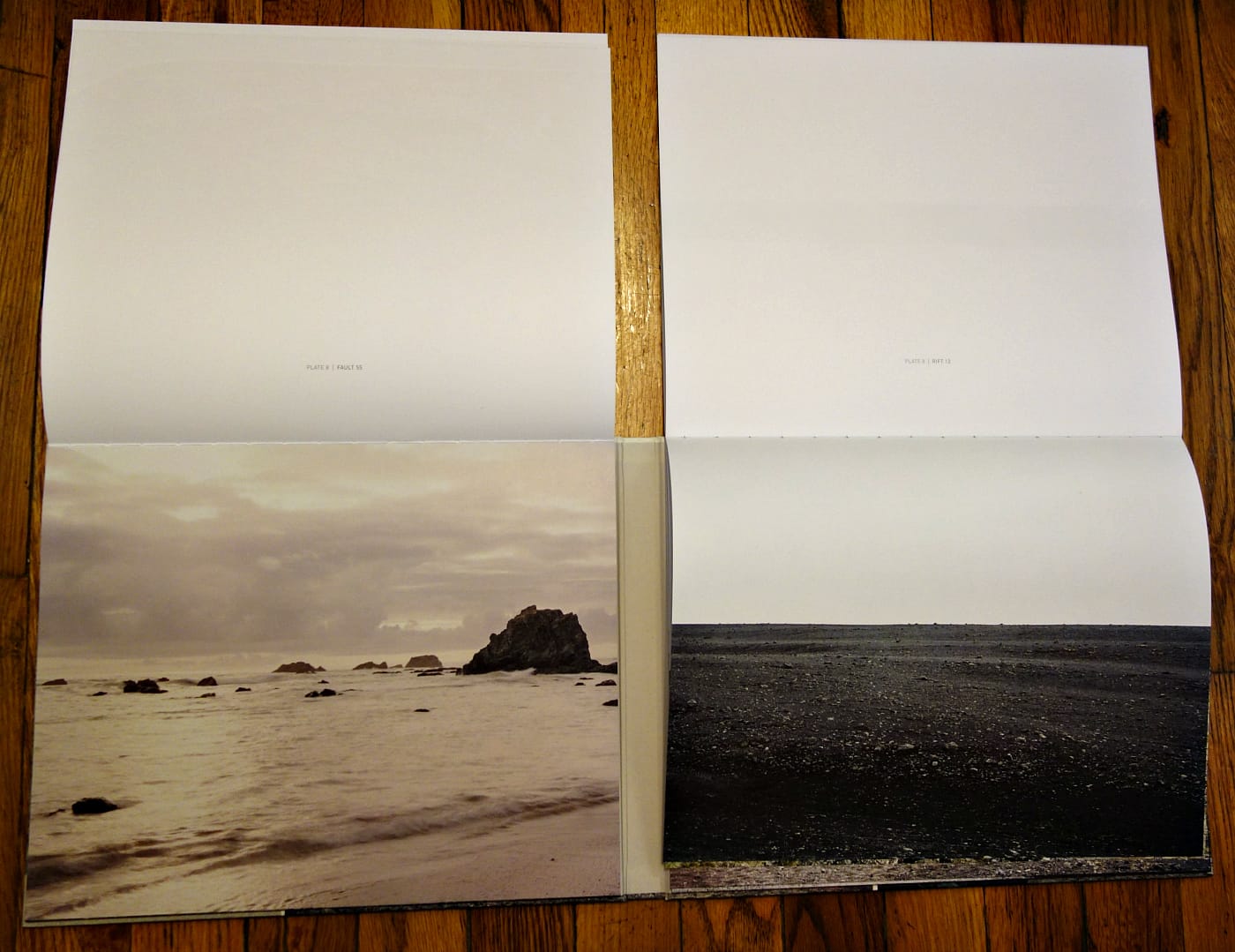 Fog and mist, captured in cool light, visually connect these distant edges of the North American Plate, although Rift/Fault feels more like two books in its design. The California and Iceland photographs are sewn separately on either side of the hardcover monograph, so you can flip through them independently or as one. This makes it a little difficult to navigate the book except on a large table, and the captions and essay by art critic Lucy Lippard are presented in a separate pamphlet. Nevertheless, the book’s instability, with a physical chasm between its two subjects, reinforces the themes of Rift/Fault. It’s a photographic tour of places where humans continue to build, whether subdivisions or geothermal plants, even as recent histories of tsunamis and lava flows are visible. As Lippard writes in her essay: