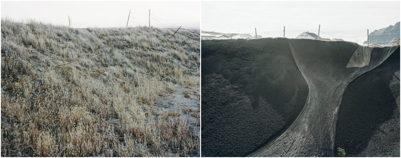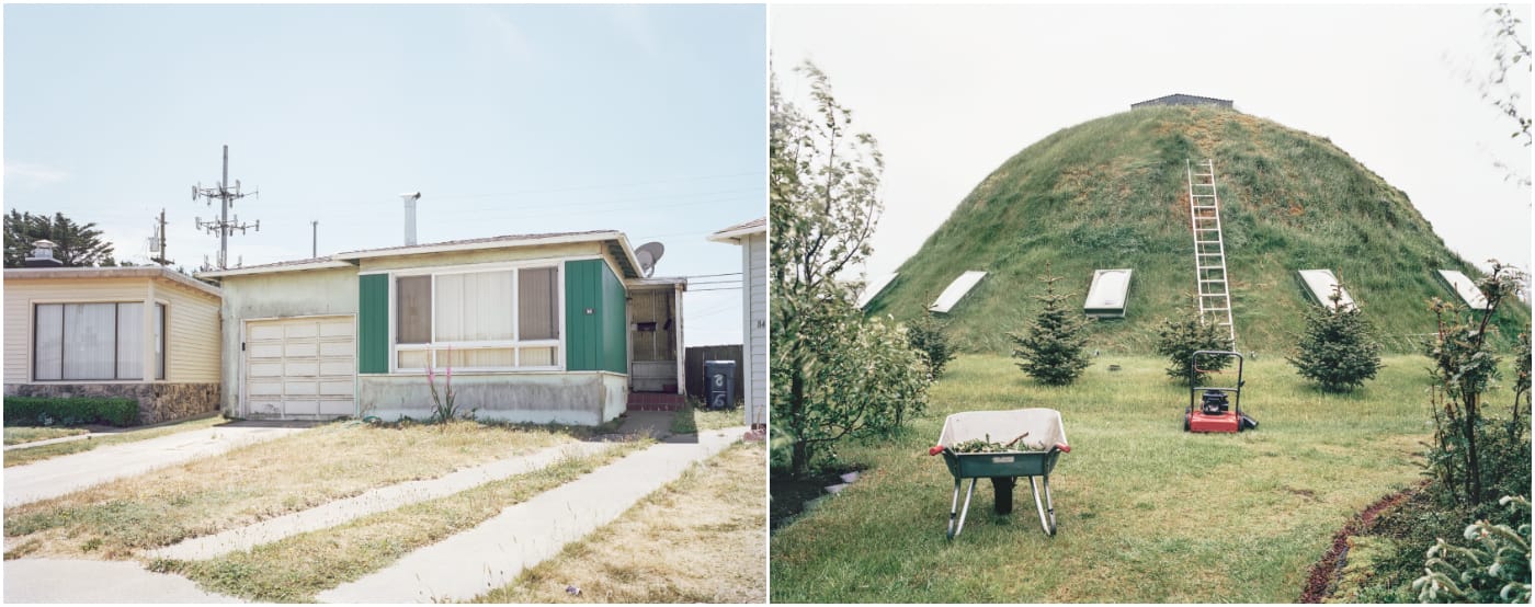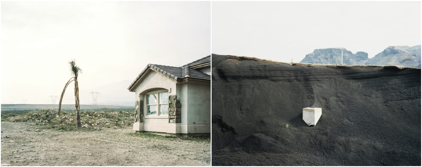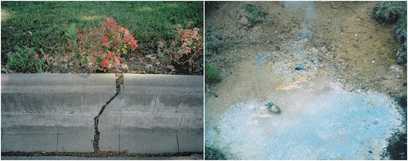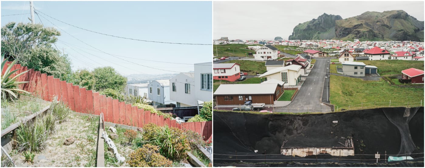 Rift/Fault, recently released by Radius Books, contrasts 48 of Belanger’s photographs from those two precarious locales. A cracked concrete retaining wall in Hollister, California, where the Calaveras Fault is splitting the city in two, is juxtaposed with a burbling mud pool in the geothermal area of Hverir, Iceland. Other images offer panoramas of the seismic scenery, such as the landslide-prone cliff of Daly City, which is perched above the San Andreas, and a dark volcanic excavation site alongside small houses in Heimaey, which experienced an eruption on January 23, 1973 — without warning, volcanic ash swallowed 400 of the island’s homes, creating a modern-day Pompeii. In another spread, Belanger compares a consumed Heimaey house with an empty one in San Bernardino, where the economic crisis stalled development.