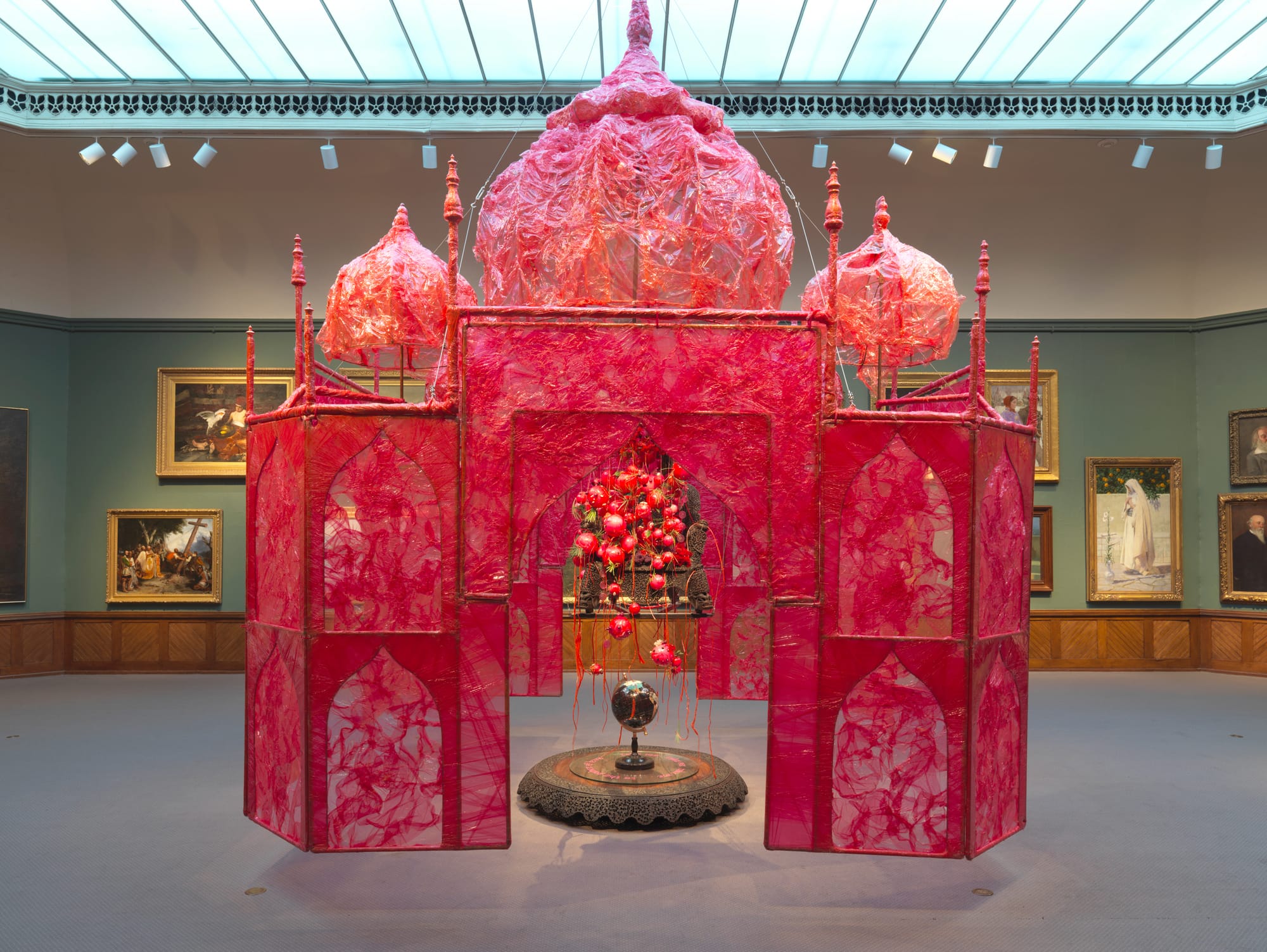 Banerjee chose red cellophane for “Take me, take me” in order to challenge Victorian customs, like those of weddings, that are still with us today. As she describes in a statement for PAFA, “ … weddings only became white weddings because of Queen Victoria. It’s Victorian modesty to not have color and in Indian tradition, a widow would not have color in their clothes.” The original Taj Mahal, recognized as one of the Wonders of the World, is made from ivory-white marble. The Mughal emperor, Shah Jahan, commissioned the building for his wife, Mumtaz Mahal, as a tomb. Bannerjee’s work playfully subverts both Victorian and Indian traditional views by using red, the color of passion.