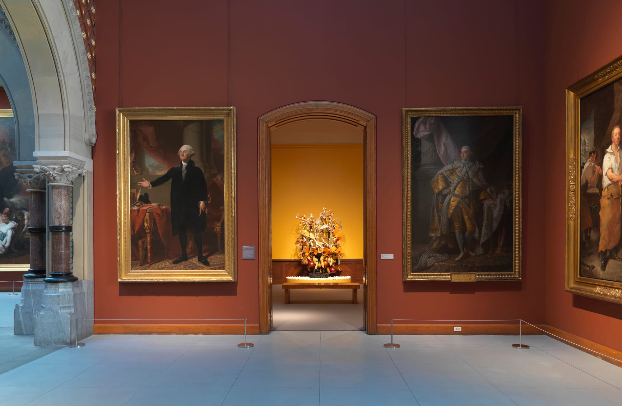 Nearly all of the subjects in the traditional portraits hail from powerful colonial families. Among them is Rembrandt Peale’s “George Washington, Patriae Pater” (1824). Banerjee’s work, thankfully, fumigates the room of its pretension. The artist reminds us that these people of enormous wealth and power used “the arm of empire to retrieve the pearl from the oyster,” as she states in another video included in the show.