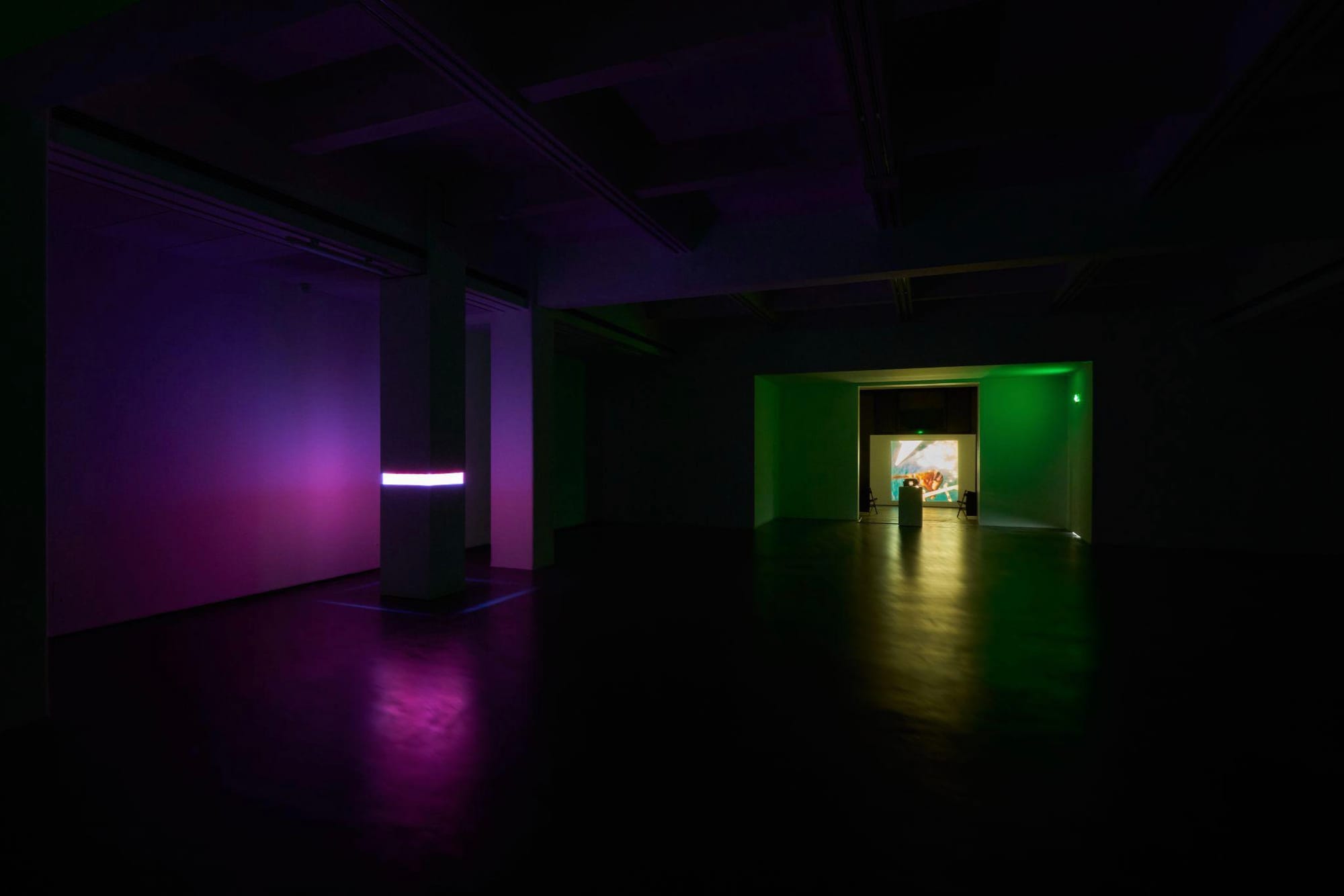 Yet while Johnson's avatar may forge their own path, there's nowhere that virtual representations of Black bodies don't already circulate, trafficked as memes, ads, and icons of pop culture. As Johnson's avatar swims away from America, they swim into conversation with this expanded world of representation. In a tender nod to this reality, Johnson grounds the Black figure at the heart of the exhibition in his own family. On the exhibition's lowest, darkest floor, a slide projector clicks through snapshots of the artist's early vacations to Hawaii: His mother beaming in a bathing suit, his father caught with a golf club mid-swing. They are images that capture both the particularities of Black childhood in the ’90s, as well as the aspirations typical to American life. Installed alongside a vitrine of glowing marine algae cultivated for the exhibition, the photos are a reminder of the immensity of the interior world of Blackness, an ecosystem of experience and feeling as vast and varied as the Pacific. And as Johnson's avatar swims between two superpowers — centers of their own ideological universes — the artist allows us to shift focus away from these monoliths towards an abundant and dynamic sea.