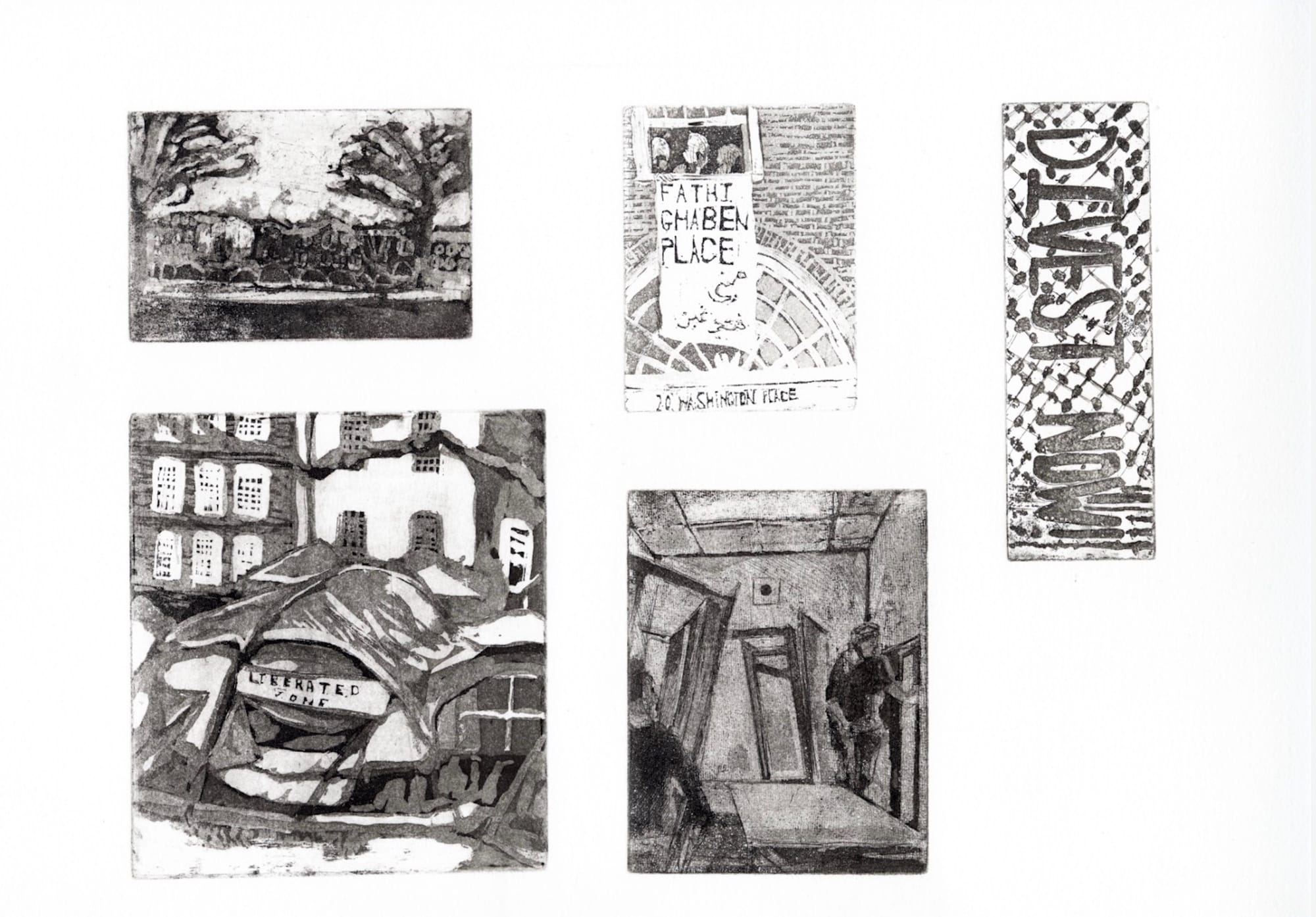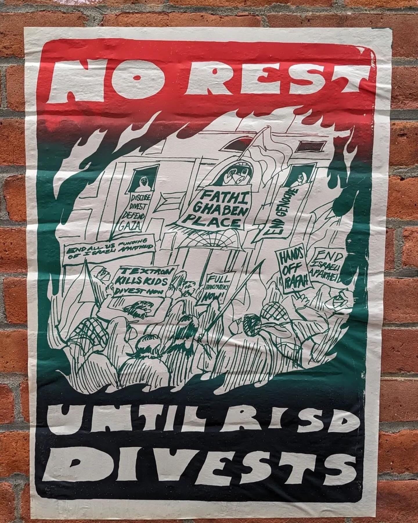 Artworks displayed in the show included depictions of RSPJ’s takeover of the Providence Washington building (Prov-Wash) last May, when they renamed it “Fathi Ghaben Place” before disbanding the protest occupation after threats of expulsion. One print read, “No rest until RISD divests.” (In January, the art school rejected a proposal to divest from Israeli military interests.)