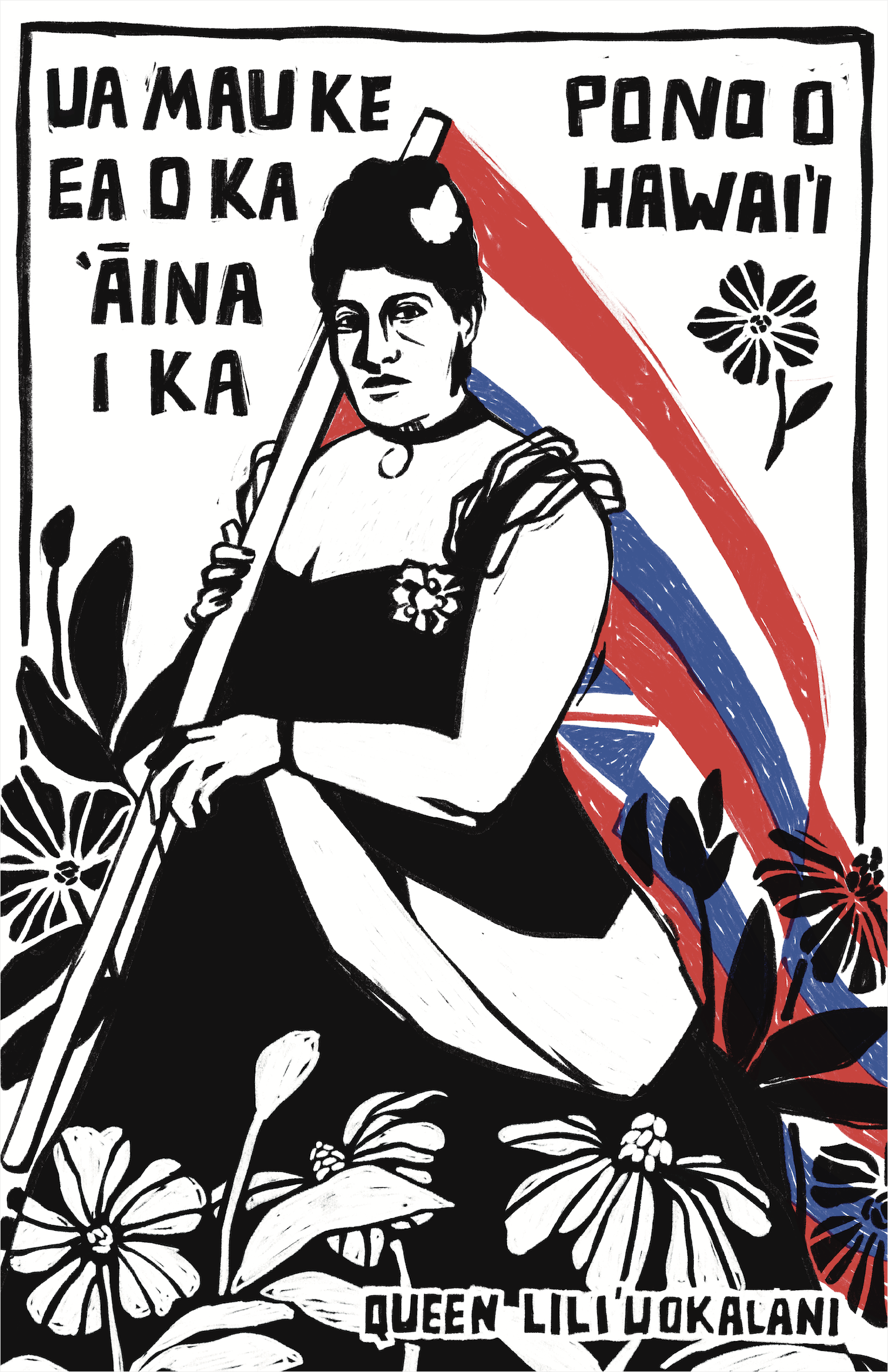 Other works in the show did not reference Israel or Palestine, instead calling out wage gaps between RISD custodians and the school’s board of trustees. Another print depicted Hawaiʻi’s last monarch before the United States takeover, Queen Liliʻuokalani.