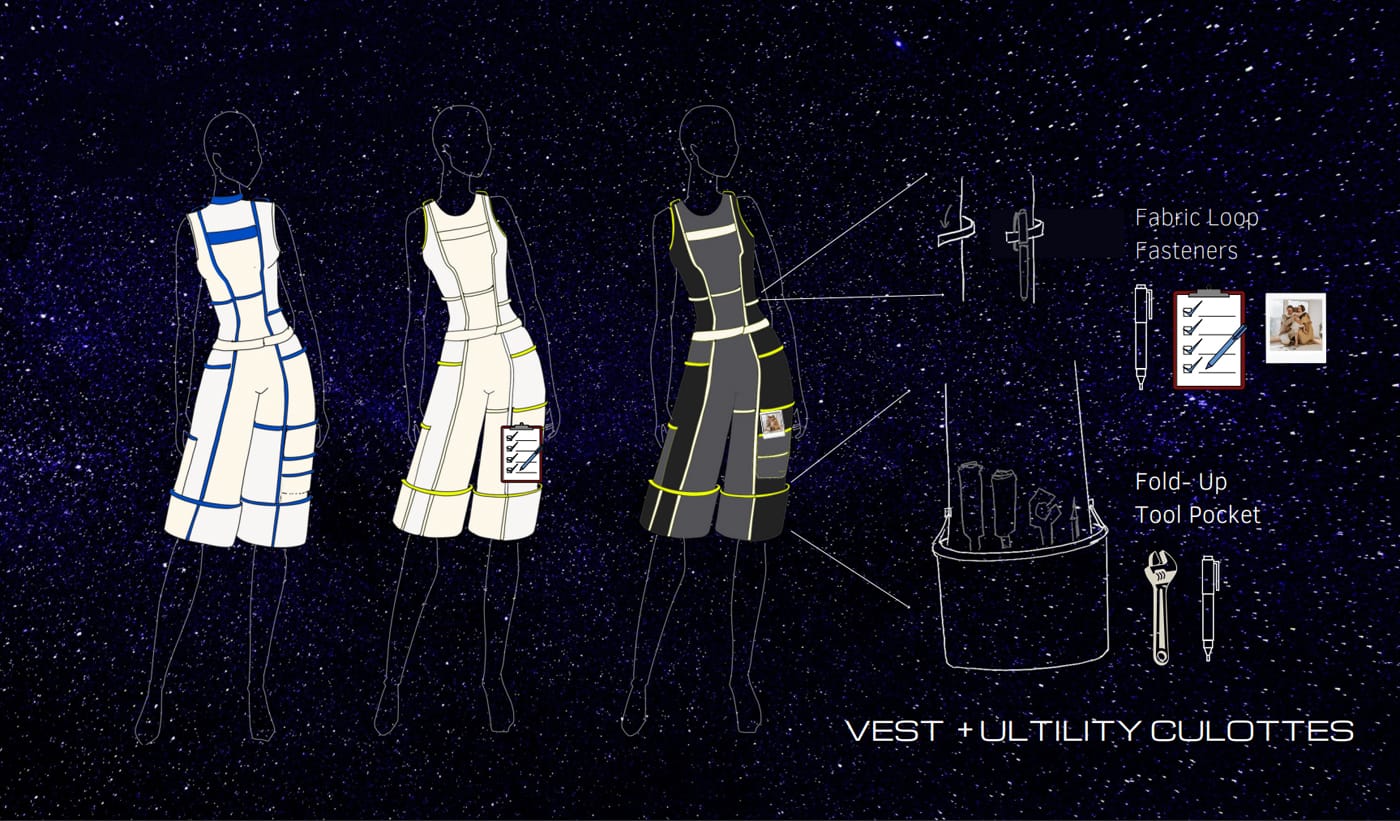 Androgenous separates by Jacklyn Kim and Ann Dinh imagine astronaut-grade "athleisurewear," theoretically presaging a new design category of "astroleisurewear". Designs by Avantika Velho address the need for utility wear, creating colorful culottes and vests festooned with pockets and fasteners that will enable astronauts to attach small and useful items to their bodies as they float around inside the space station — a situation that Stott related was generally addressed by using lots and lots of Velcro.