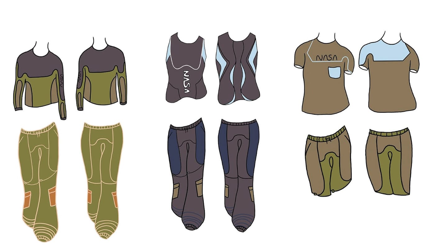 The designs created by RISD students will potentially be worn by nine men and nine women on the mission Artemis, slated to travel to the moon aboard the Orion for the first lunar landing since Apollo 17 in 1972. Their designs must consider temperature variance, privacy, functionality, and—of course—performance in zero-gravity conditions. Clothing designed for wear in space not only has to address a range of functional challenges, including zero-g bathroom protocols, it also has to bear strict budgets in mind.