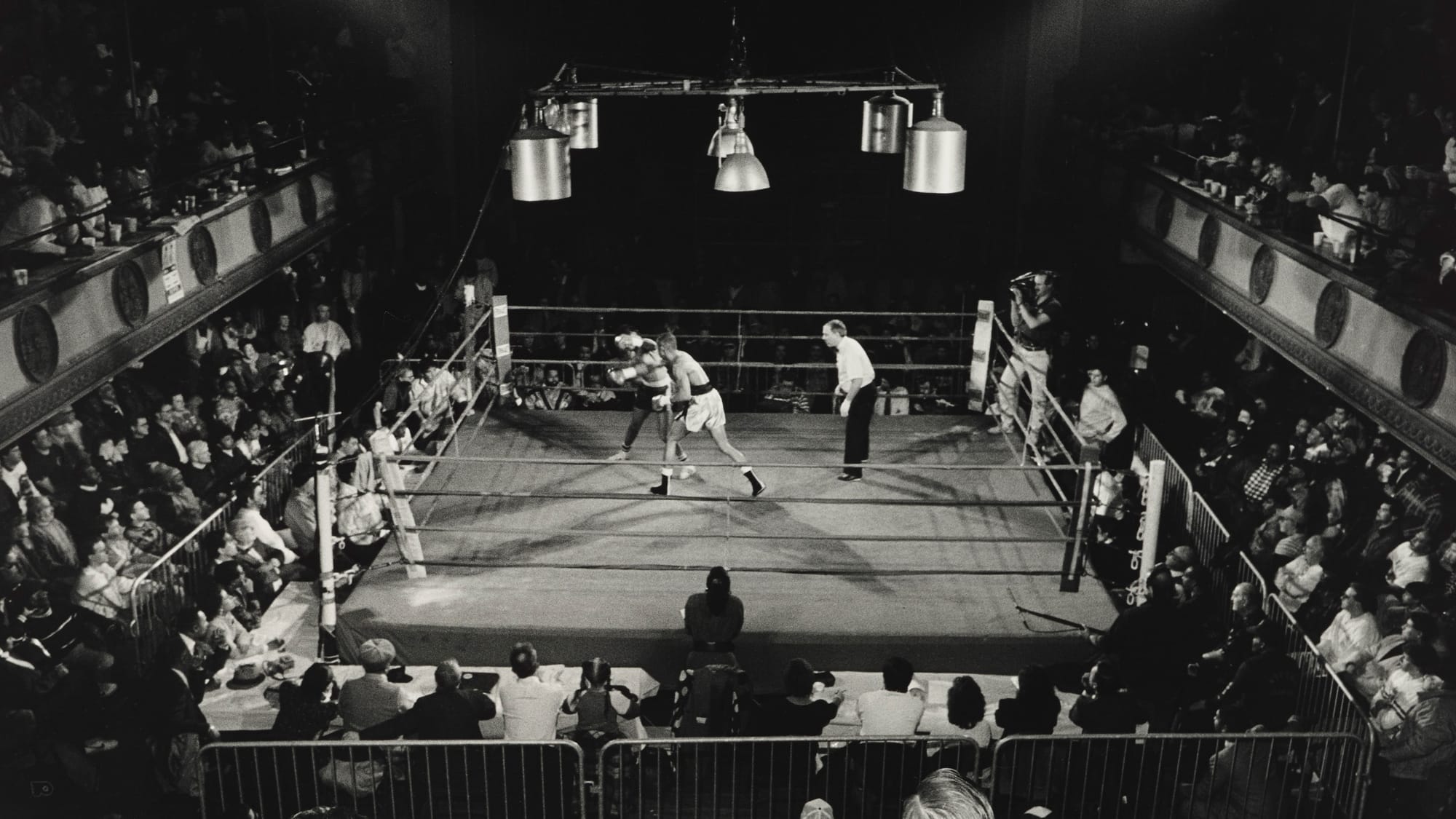 Left: Larry Fink, “Blue Horizon, Philadelphia, Pennsylvania, January 1990” (1990) (© Larry Fink/MUUS Collection); Right: Alex Webb, "Philadelphia, Rock Ministries Boxing Club" (2016)