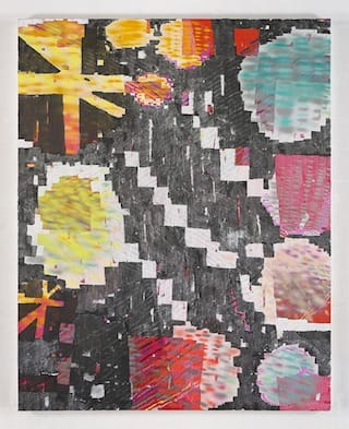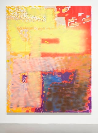 Ferris doesn’t try to tie a painting together or ally herself with an approved of authority — be it high abstraction (Frank Stella), Pop references (Andy Warhol) or ready-mades (Marcel Duchamp). In fact, she consistently undermines her allusions to Stella by embracing blurred forms, such as in “Manuscript” (2012), where a hazy shape hovers between the comprehensible and the incomprehensible without becoming one or the other. Ferris achieves this experience of confounded looking (or reading) at a high level, which is rare in painting, but is more commonly found in wildly innovative, non-storytelling poetry. And just to be clear, it is certainly not an experience that exists solely in the realm of abstraction, as a number of recent paintings by Sangram Majumdar make evident.
