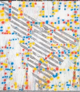 When Ferris uses a spray gun to make stepped rows of blurry blue, red and yellow spots, as she has done in a number of paintings — none of which are in the current exhibition –what she really seems to be doing is time traveling Mondrian’s “Broadway Boogie-Woogie” (1942–43) into the present. I am advancing that Ferris is literally presenting us with what the Dutchman’s painting would like if it were done now — in the age of America’s material decline, with its blocks of crumbling infrastructures and rows of glowing computers. Instead of coming across as another updated version of Mondrian’s synthesis of improvisation and order (in an institutionally approved, postmodern citation, complete with the requisite dose of irony), we encounter Ferris’s edgily orchestrated collisions of improvisation and decay, order and randomness.