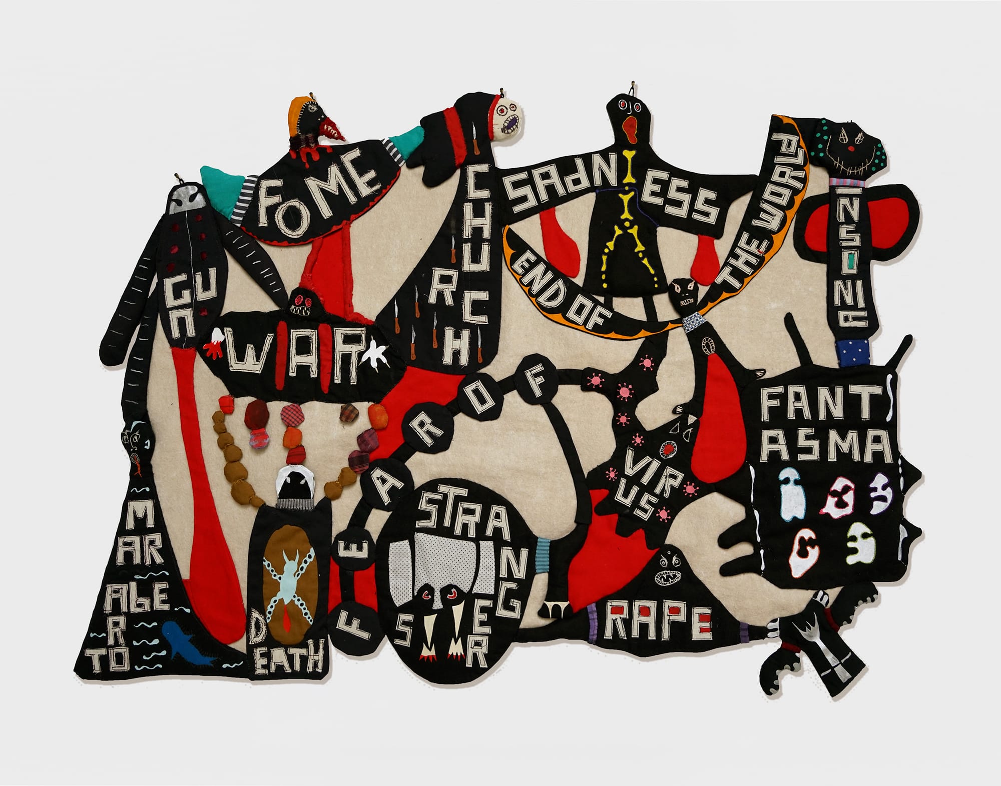 On the opposite wall is “Fear of” (2020), a fabric, thread, and paint composition hand stitched by Neuenschwander. I imagine she accomplished this marvelous, painstaking work, which evokes folk art, in seclusion; under Bolsonaro, Brazil has been ravaged by the pandemic. Images and figures from the À espreita drawings now list their fears. Fear of war, church, end of the world. Fear of strangers and sadness. Fear of virus. Fear of rape. Neuenschwander focuses not on the machinations and harmful policies of powerful leaders, but instead on the experiences, visceral and emotional, of many people in this stricken time. I have not seen many exhibitions over the past several months. I am grateful that I have experienced this one.