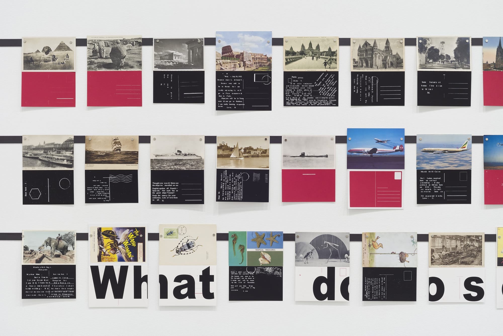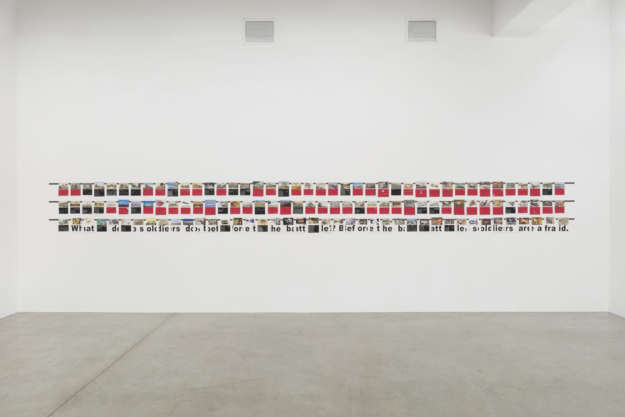 Neuenschwander’s installation is composed of postcards that correspond to those in the film, and she went to great lengths to find exact matches (for instance on eBay or elsewhere on the internet). They are displayed as a horizontal grid in three rows. Each postcard is coupled with a silkscreen on paper (most red or black) showing the back of the postcard, whether it contains nothing, an address, a vacation report, or a heartfelt message sent to a loved one. Images in a fictive film are physicalized and suffused with actual history — not huge historical events but instead people’s travels, adventures, family connections, and relationships. At the bottom, in truncated black letters stretching from silkscreen to silkscreen, is a quote from the movie: “What do soldiers do before the battle? Before the battle soldiers are afraid.”