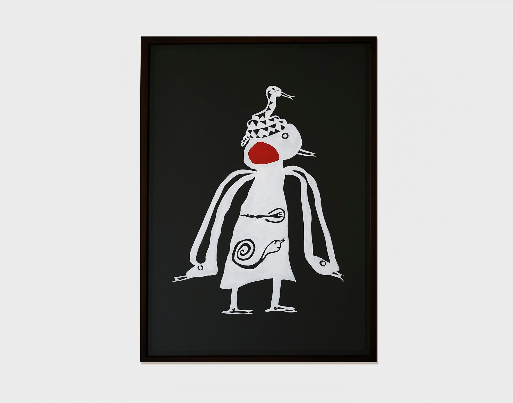 A boxy, low-slung creature with webbed feet and evil eyes, inside an irregularly shape red outlined, advances on viewers from the dark (“À espreita [Escuridão]”), while a ghostly figure, in what looks suspiciously like a priest’s robe festooned with a red cross and dripping blood from the sleeves, reveals the black outline of a skeleton (“À espreita [Morte]”). In “À espreita [Minhocas],” what looks like a coiled snake (although Minhocas means “earthworms”) protrudes from the head of a shocked girl. Her arms are dangling worms or serpents and her dress or body displays a similar creature. The vulnerable body invaded by dangerous things strikes quite a nerve now. Together, Neuenschwander’s drawings tell a collective story of vulnerabilities and anxieties.