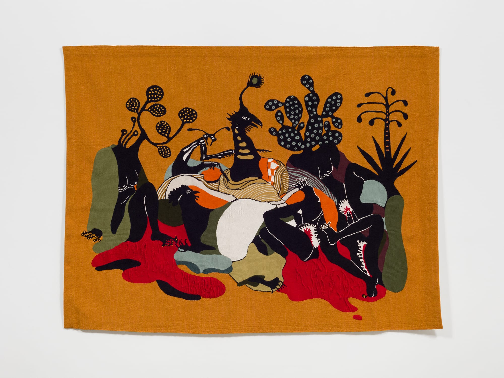 These potent images mesh with those in the tapestries and paintings of Neuenschwander’s series Trópicos malditos, gozosos e devotos (Tropics: Damned, Orgasmic and Devoted), in the main gallery space. The title is from Brazilian writer Hilda Hilst’s 1984 collection of poems Poemas Malditos, Gozosos e Devotos. With their tropical colors, organic shapes, and beguiling textures, the works — especially the tapestries made from cotton, wool, and acrylic fiber — are gorgeous and seductive. They are also harrowing.
