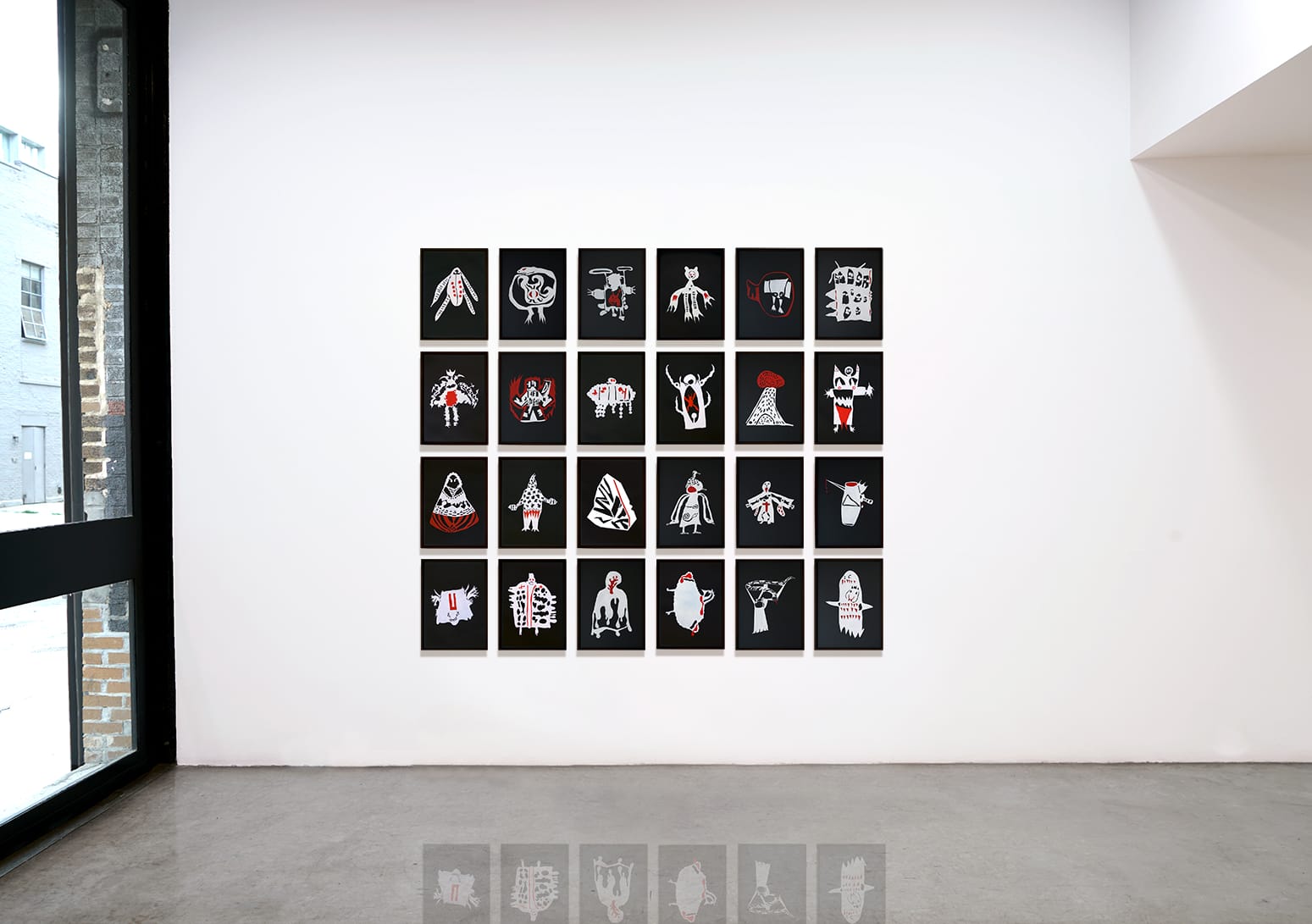 Neuenschwander has previously incorporated her own versions of these drawings into immersive interactive installations — for instance as looming projections from transparencies that viewers could manipulate, thus changing the installation. Interactivity is now out, due to the pandemic, and so in the series À espreita (translated from Portuguese in the press release as “on the lookout” or “watching”) Neuenschwander repurposed and transformed 24 of her drawings as small (14 by 10-inch) acrylics on paper (all 2020), displayed as a grid on the gallery’s front wall. Her versions are luminous, mostly white reverse silhouettes, with bursts of red, on inky black grounds. While they still resemble children’s drawings, the artist lavished care on them, with her spare yet vivid palette and fastidious brushwork.