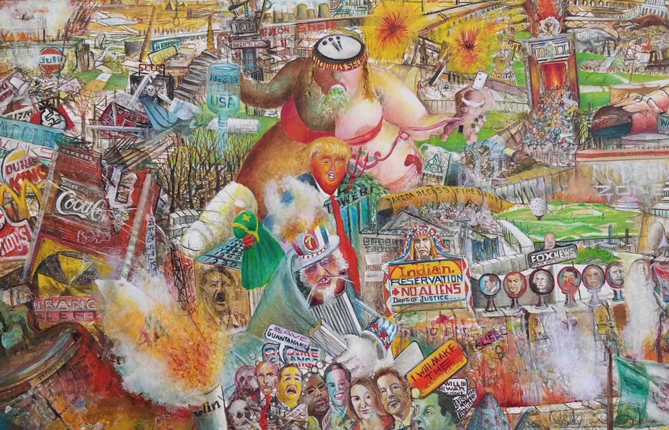 Cenedella is known for colorful and often crowded satirical paintings, some of which have featured Santa Claus and Donald Trump. True to his reputation, he appeared in court wearing a purple and white checkered shirt, along with a tie knitted from multicolored yarn.