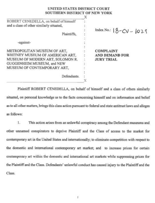 In an 18-page court filing, Robert Cenedella alleges that a “corporate museum cartel” engaged in an “unlawful conspiracy” to manipulate the market for contemporary art. The lawsuit, which first surfaced on Bloomberg, says the Metropolitan Museum of Art, the Whitney Museum, the Guggenheim Museum, the New Museum, and Museum of Modern Art all excluded Cenedella and “innumerable other deserving artists” while driving up the prices of their collections.