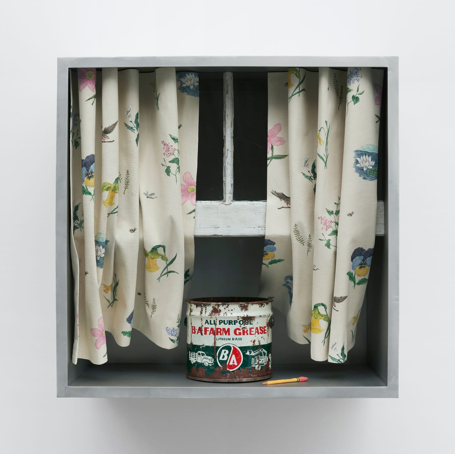 Gober’s evocation of a breeze calls attention to the viewer’s presence. Are we outside the window, looking in at the rusted, empty can of farm grease resting on the sill? If the curtains are behind the window, suggesting that we are outside, why is the inset metal lift facing us? It does not face us in the bottom frame, on the opposite wall, where the curtains hang outside the window and seem to blow in. What does it mean to be both outside and inside the space implied by the half-open window? Are we both inside and outside our body or the room? What does the feeling of dislocation signify? Does it refer to the human impulse to compartmentalize when the body is threatened or, to take a cue from Gober’s drawing, treated like garbage? How much do we know about what is going on in the world around us? How much do we want to know?