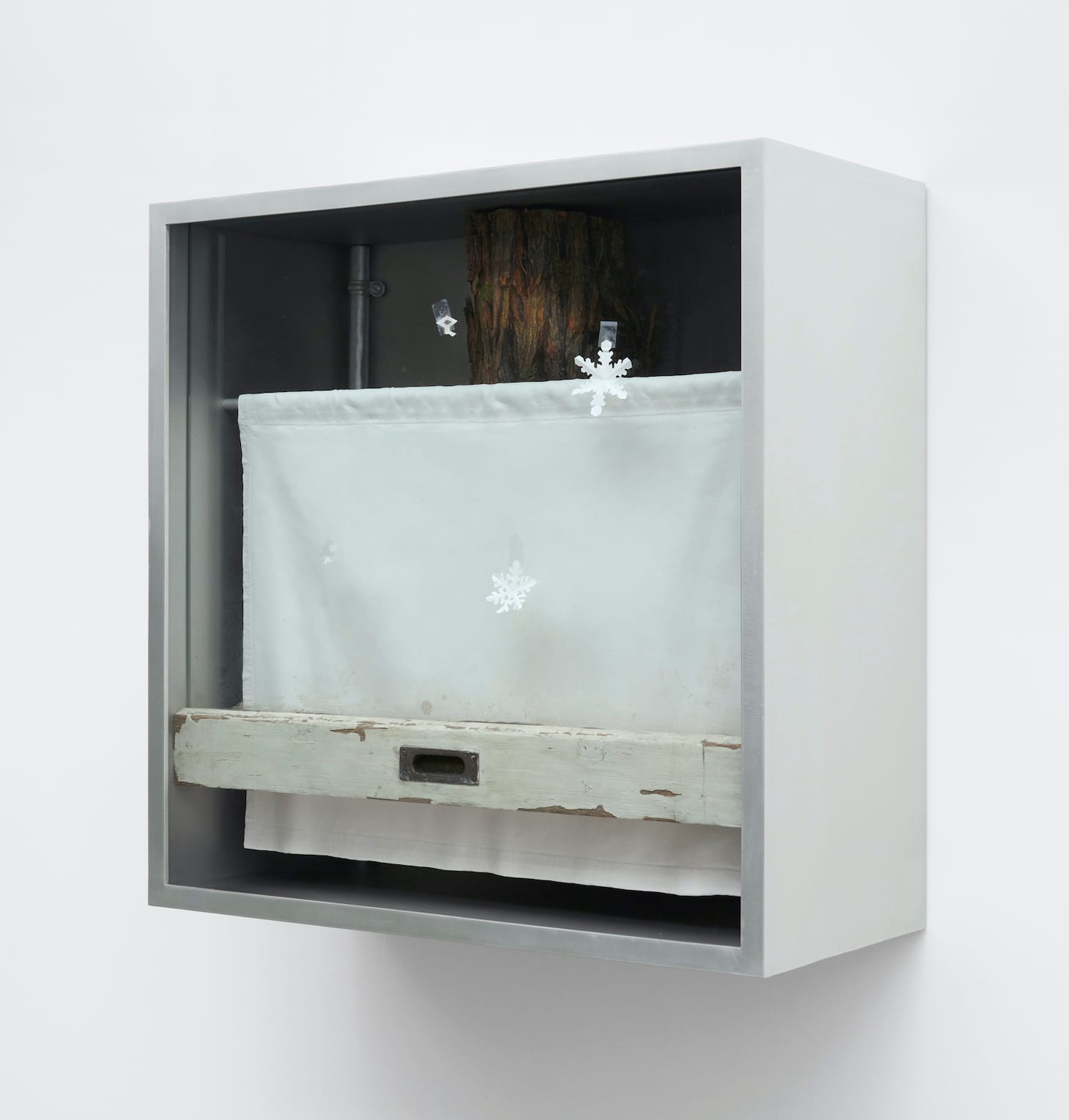As I left the gallery, I stopped at certain pieces, to double check my first impressions. Did the vertical log behind the cloth in “Untitled (2020-21) rise above the top edge, where it is prominent, but not continue below the cloth’s bottom edge, which is only a short distance from the bottom edge of the box? Why did Gober leave this absence? What about the cut paper snowflakes, some of which are torn? Who tore these parts off? Why are they taped on the outside of the window and not on the inside? In these works, Gober pulled me into another world, one that was both illuminated by natural light and full of cold shadows. At no point did I feel like I had the answers to these questions. It was not necessarily a comfortable place to be, but it was deeply and profoundly moving.