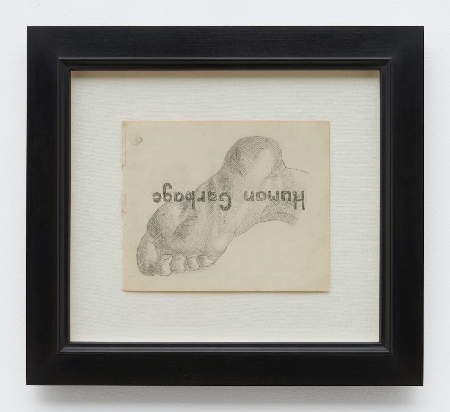 The memory of this article was stirred up by the shadow boxes, which contained the window frame and the other objects that Gober carefully replicated, but I must emphasize that this is not the lens through which I saw the artwork. Rather, Gober’s placement of an untitled drawing on the wall between two facing walls, and the shadow boxes he placed there, is what prompted me to consider a possible connection between the work and the article. On a found drawing, a 19th-century academic study of the bottom of a foot (likely done in an art class), Gober wrote in stencil-like letters the phrase “Human Garbage.” He inverted the drawing, echoing its viewpoint, so that the foot and phrase are upside down. One of the unsettling things about this drawing is that Gober does not provide a context: he offers no anecdote or narrative, which would enable us to maintain an emotional distance from the pairing of a corpse-like section of a bare foot and the phrase, as well as give the viewer a way out of feeling implicated in the work.