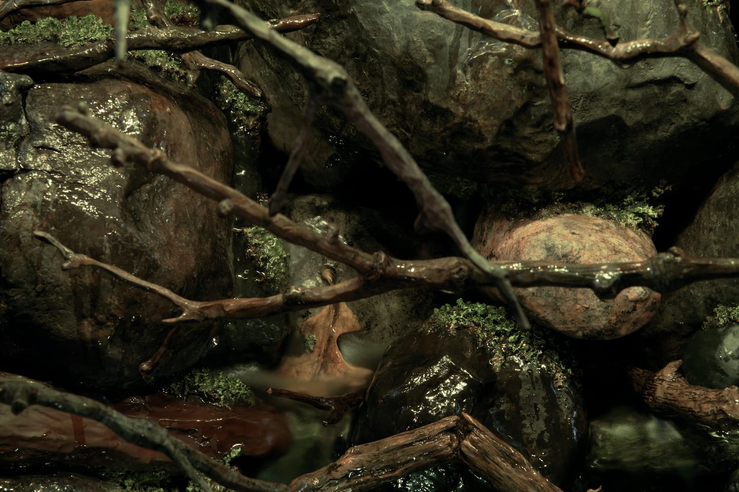 “Waterfall” (2015-16), on its own wall, invites the viewer to go down another rabbit hole. A dark blue jacket the color of a policeman’s uniform faces the wall and seems to be entering it. On the back of the jacket is a small aperture framed in metal. The viewer has to come close to peer inside, which allows you to momentarily forget where you are. We are pulled into an underground world made of rocks piled upon each other, thin branches, light from above, and a steady flow of water running over the rocks. Are we animals living underground? Is this world inside the uniformed person’s body? What is outside? What is inside? Where is the uniform going? Or is it stuck?