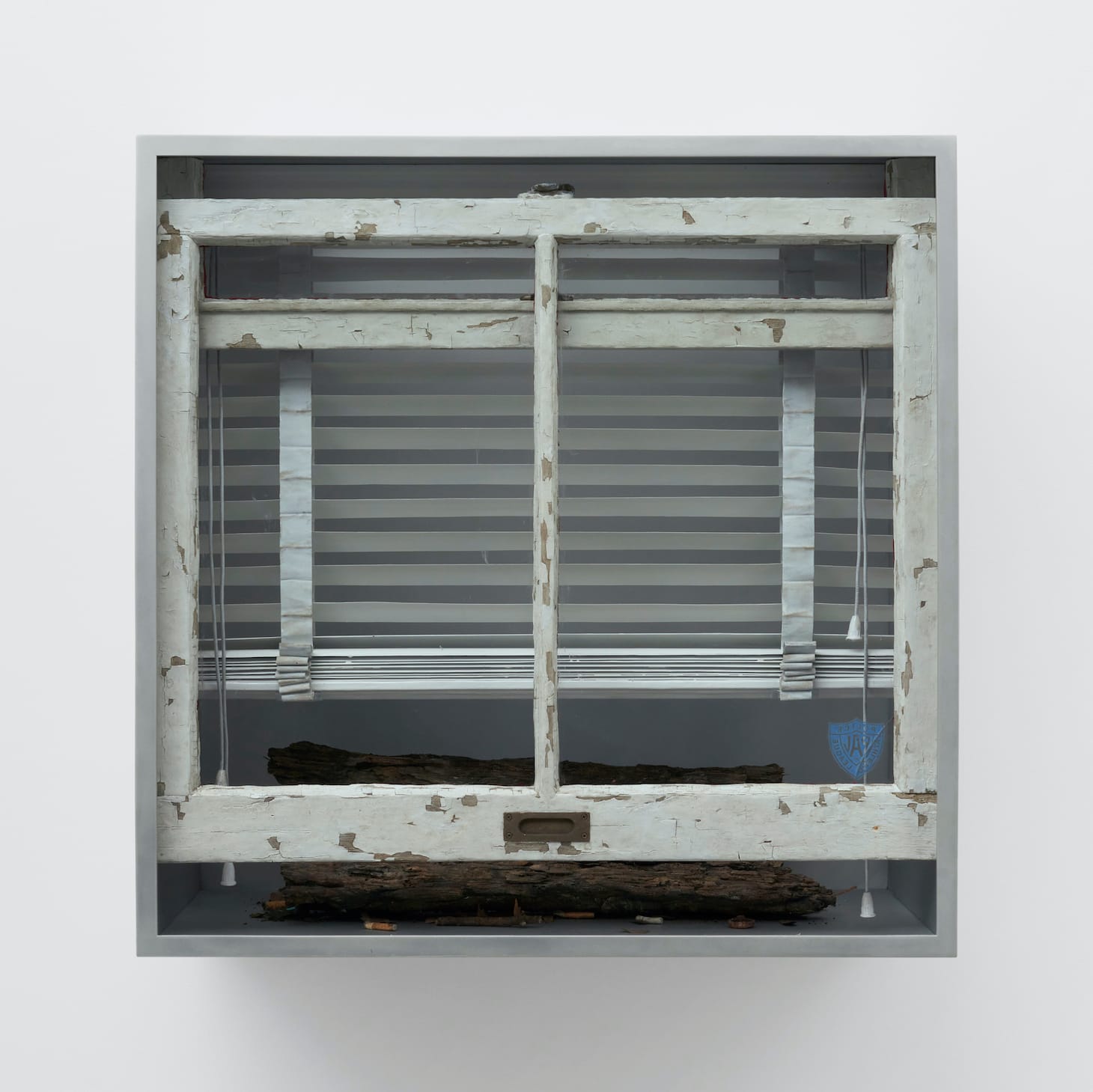 In the next gallery space are two pieces both titled “Why didn’t I” (2020-21), installed on opposite walls. Again, the artist has compressed the outside and inside: Venetian blinds are on the “outside” of the window, while the window’s inset latch is on the “inside.” Within the box, resting on the sill, is a rotting section of log, with one tiny green plant rising from one side, evoking death, decay, and rebirth on the broadest level. What are we to make of the smoked cigarette butts and rusted bottle cap visible beneath the log? Are they markers of linear time juxtaposed with the log’s allusion to circular time? We live in both, don’t we? To whom is the works’ shared title addressed?