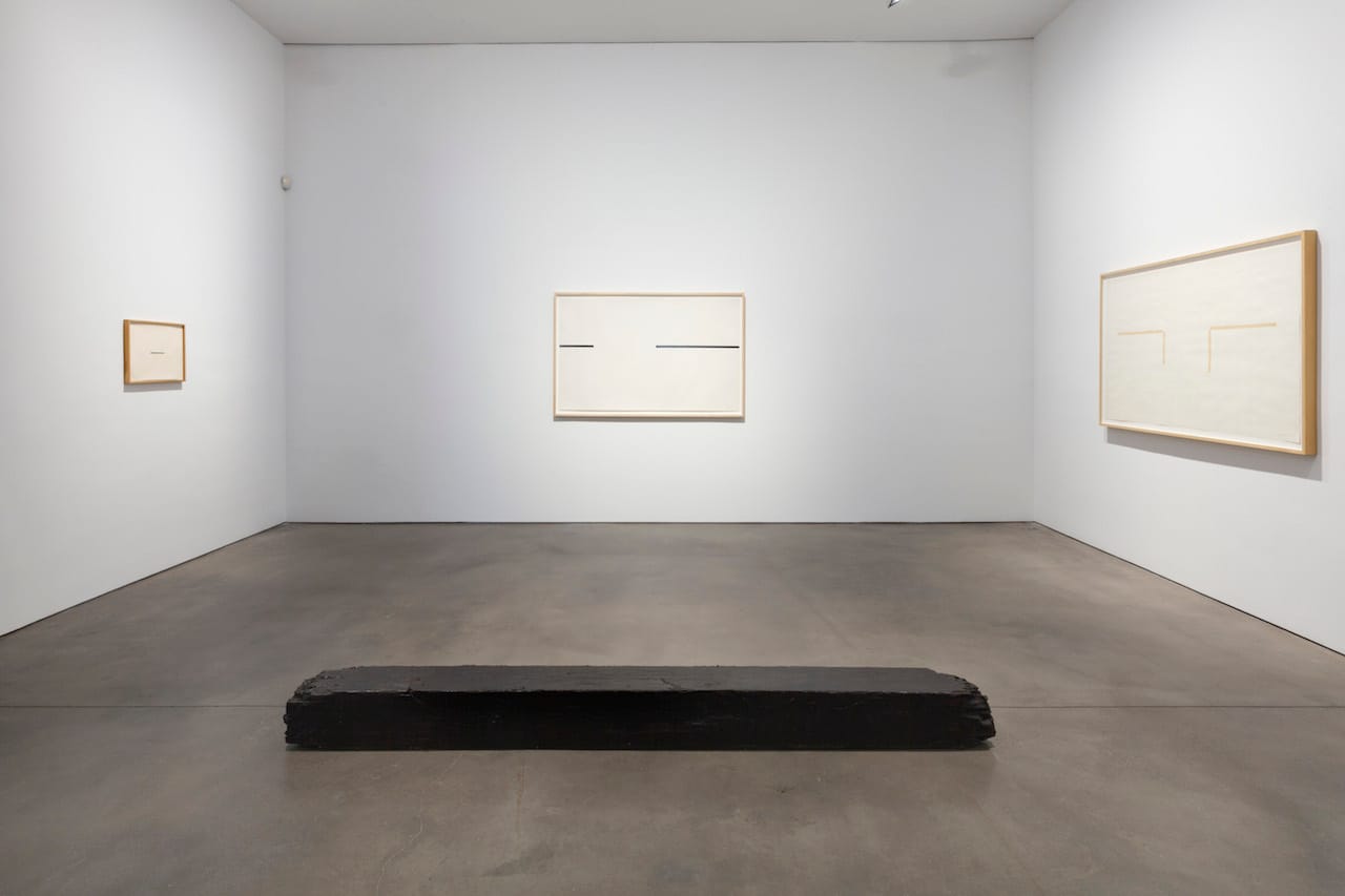 According to the gallery press release, “Untitled” is a “wood beam” which was “fractured using precise and repeated force from heavy machinery.” It reminded me of a railroad tie, whose ends have been splintered somehow. Grosvenor has patinated “Untitled” in creosote and grease so that it becomes a black, damaged object resting on the gallery floor. In contrast to the Minimalists, with whom he has often been associated, Grosvenor’s “Untitled” is not pristine, but marked by what was done to it, a scarred thing.