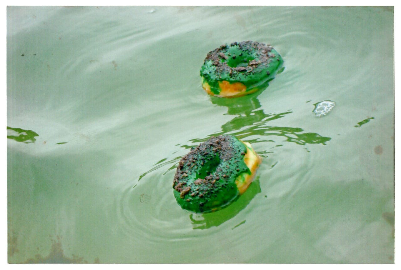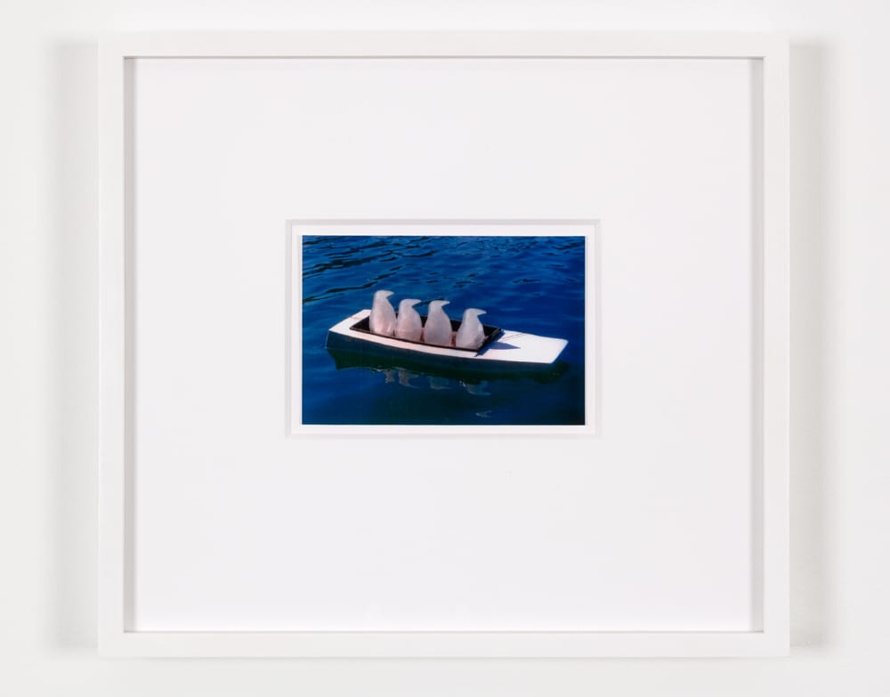 One photograph in the exhibition is of two donuts with green frosting and brown granules, floating, like a pair of life preservers, on rapidly moving water. In this work the viewer gets a sense of Grosvenor’s ability to make connections, to recontextualize a familiar object so that it reveals its material state, the green frosting echoed by the pale green water. One of the disturbing things about Grosvenor’s photographs is that the absurdity of the situation stops striking us as fictional: there is no life preserver that can save us (I say “us” because there are two donuts); the four penguins in the boat cannot survive. And yet the artist is not a doomsayer, nor is he being apocalyptic. That is what is even more disturbing. He doesn’t give you a way to dismiss his work because he isn’t making any claims about its meaning. Maybe it is just two donuts floating on water and four ice penguins in a boat.
