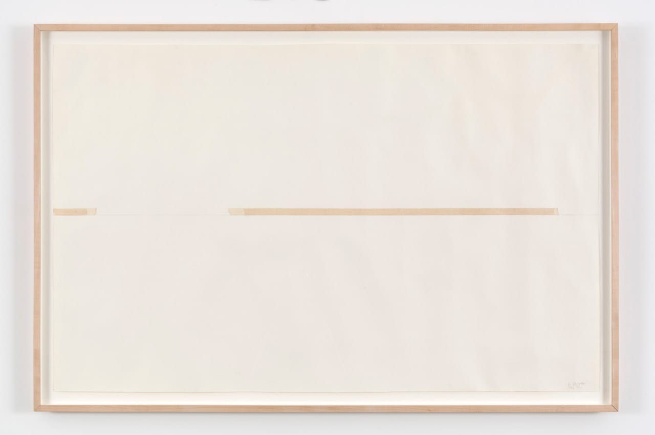 I was reminded once again of this encounter when I went to Grosvenor’s current exhibition at Paula Cooper (April 25–June 26, 2015), which consists of two large-scale sculptures, “Untitled” (1975) and “Quadrum” (2005-2006), each given its own room, along with a selection of masking tape drawings from the mid ’70s, and a group of photgraphs that were done over the past decade and a half. There is also a book of Grosvenor’s photographs, 32 Pictures (Karma, 2014) with an essay by Bob Nickas, on the the front desk, that I highly recommend looking at.