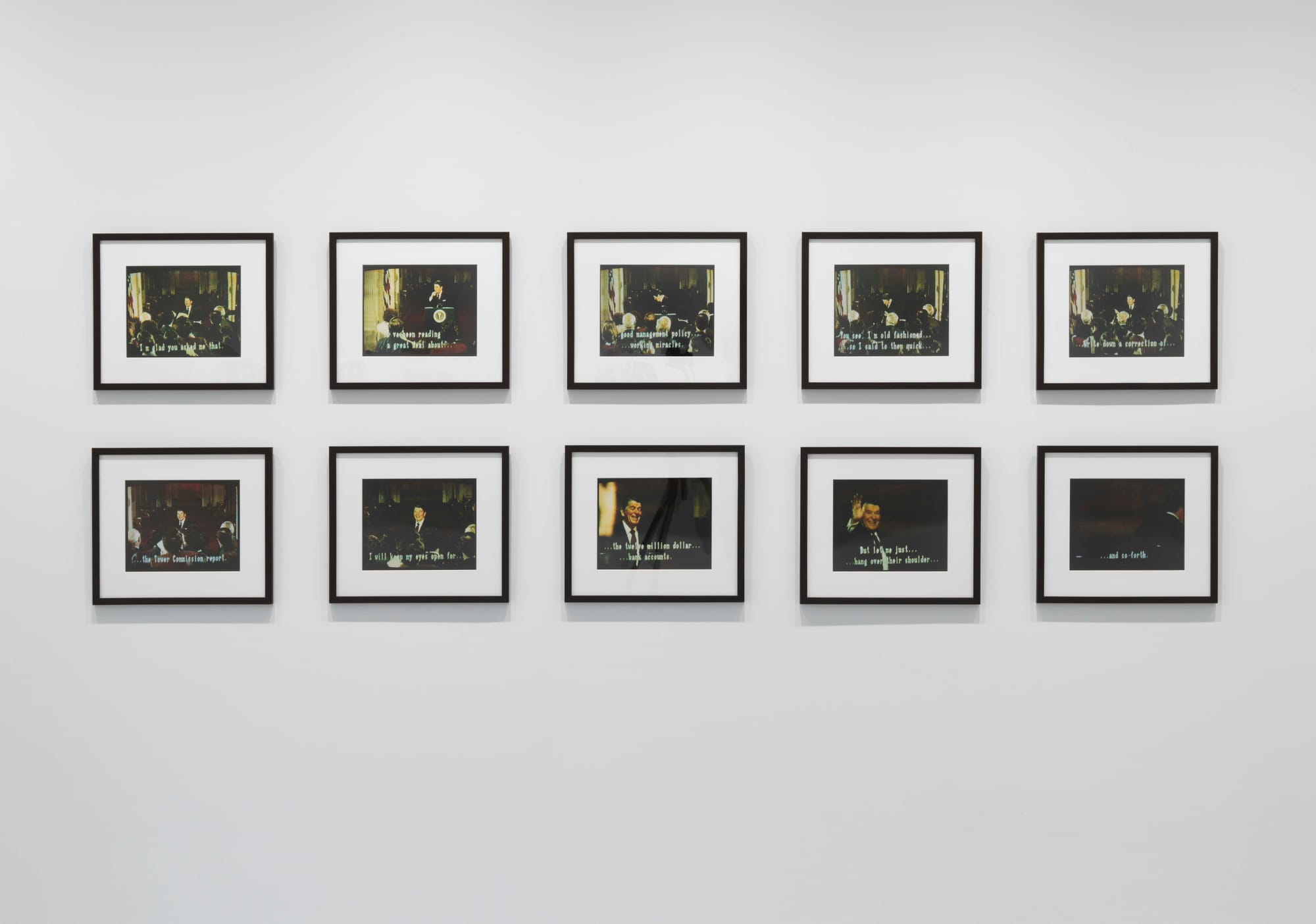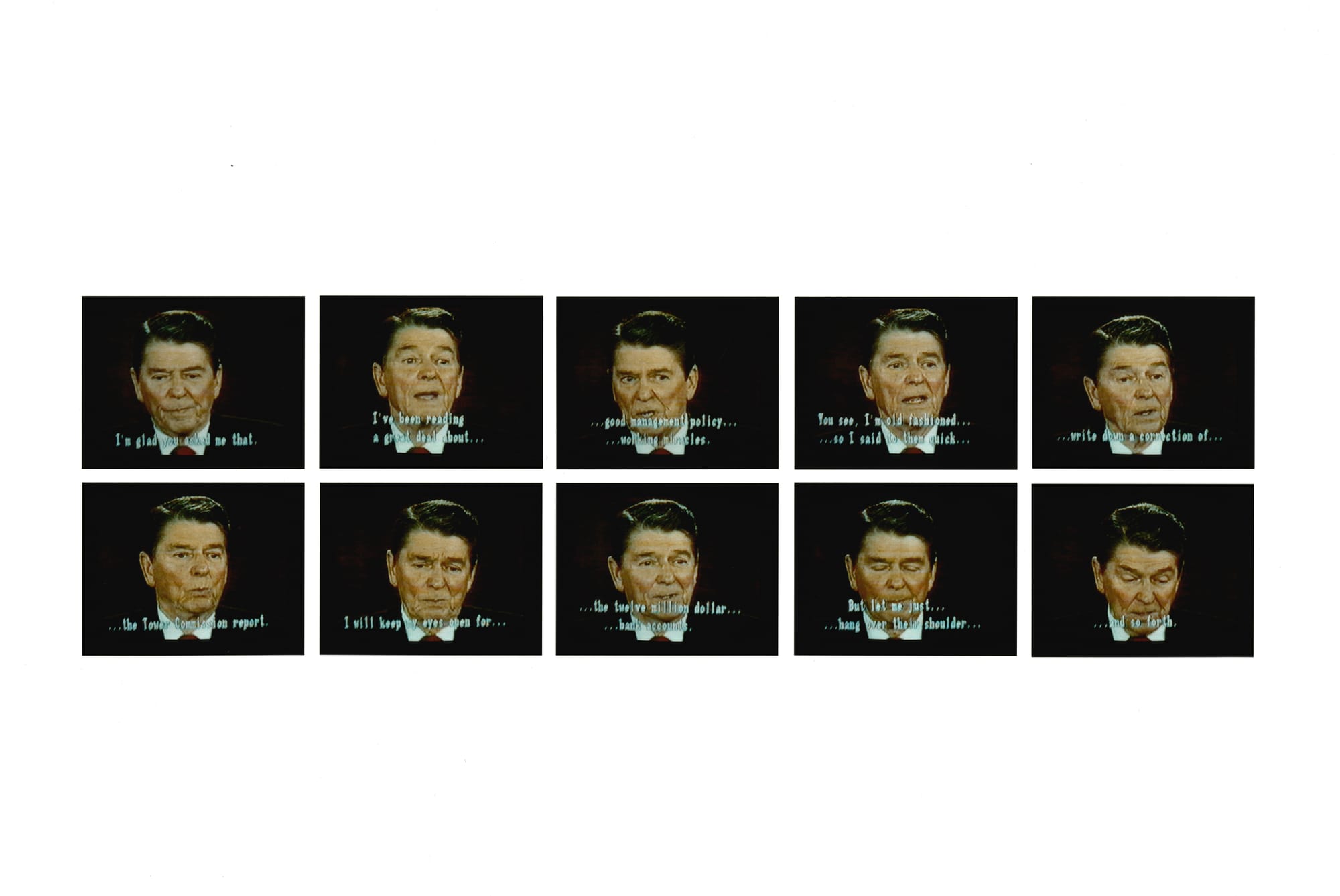 In “Mr. President… Mr. President… C, set #1,” these words are superimposed on close-ups of President Reagan’s face, while in “Mr. President… Mr. President… A, set #2” the images show Reagan stepping from lectern and retreating into the dark. In the first series the words evoke an intimate, confident feeling; while in the second they come across as distant, guarded, and defeated.