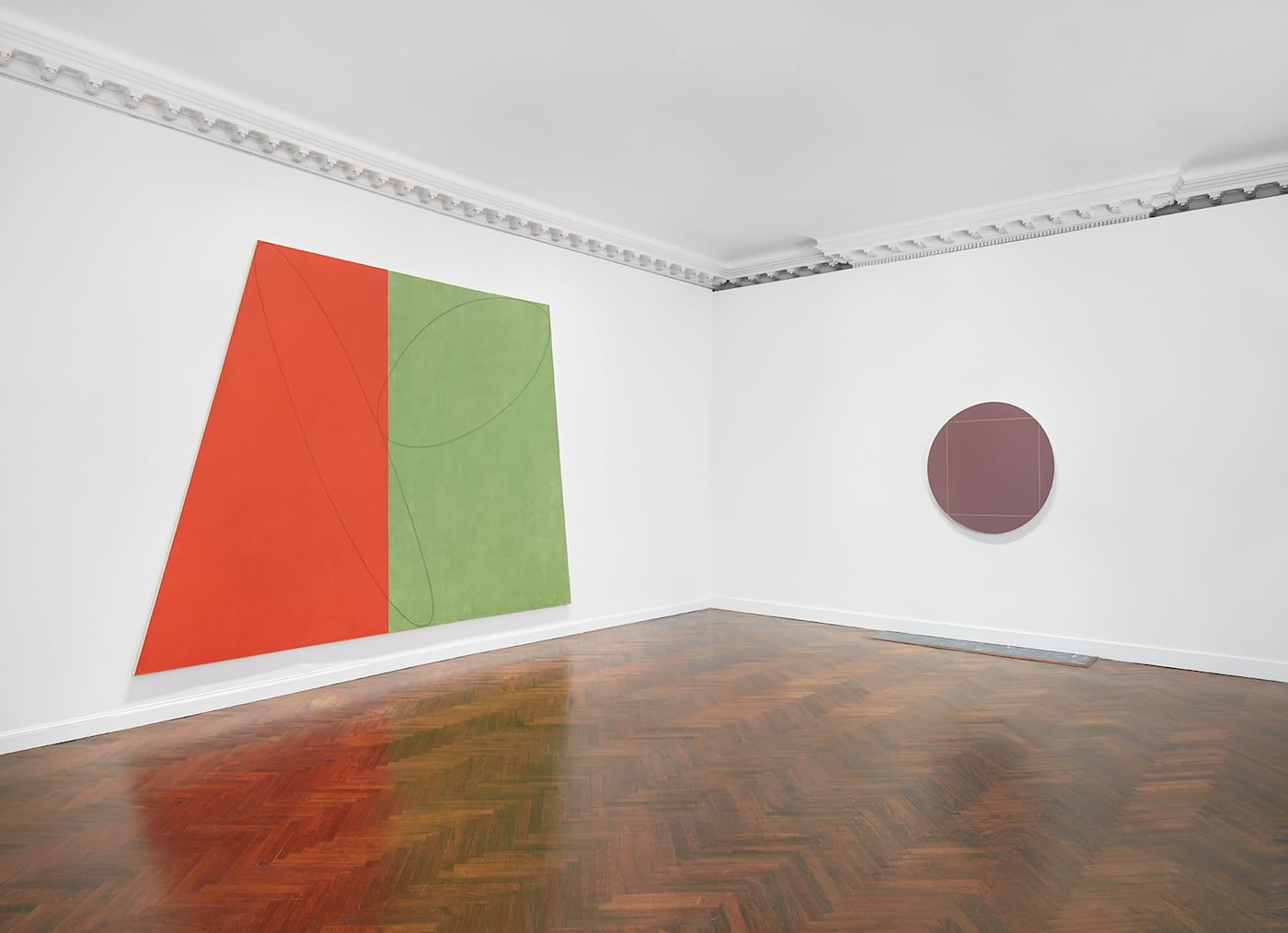 In “Circle Painting # 4” (1973), Mangold draws a square in white pencil on the circle’s violet ground. The lines of the square, meet the circle’s circumference on the left, but do not do so on the right, extending instead beyond the outer edge. This simple fact is visually arresting. The square’s missing right corners introduce a note of instability into the circle’s otherwise stable form. Nothing, you might conclude, is secure or permanent. Although I do not think this was Mangold’s intention, his work seems to incorporate the quiet doubt running beneath everything we undertake, the sense that whatever we plan to do, we might very easily have miscalculated. For all of their coolness and classicism, this is what makes the work feel deeply human to me.