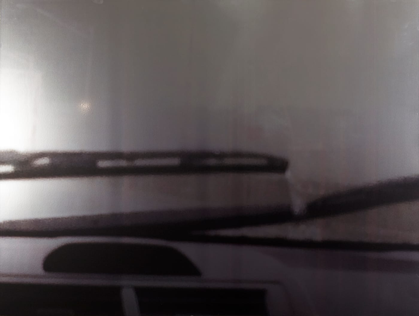 “Car Window 16” (34 by 45 inches, latex ink on silver vinyl mounted on Dibond; 2016) is a passenger-side view of dashboard, air vents and wiper blades that are cropped to near-abstraction and crammed into the lower half of the composition. The high contrast, low-resolution photographic information is printed on reflective vinyl film, so the upper half — the sky, or anyway a featureless background — is a misty expanse of mid-tones in which the features of the exhibition space itself are dimly reflected.