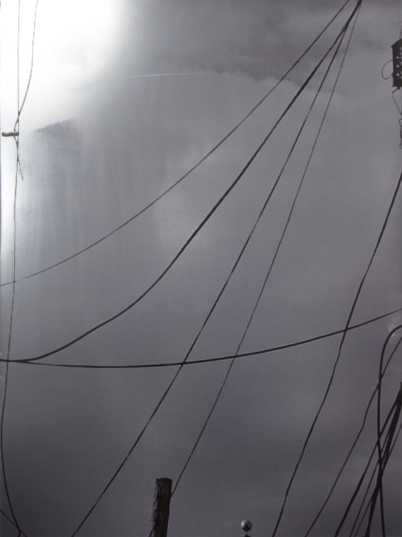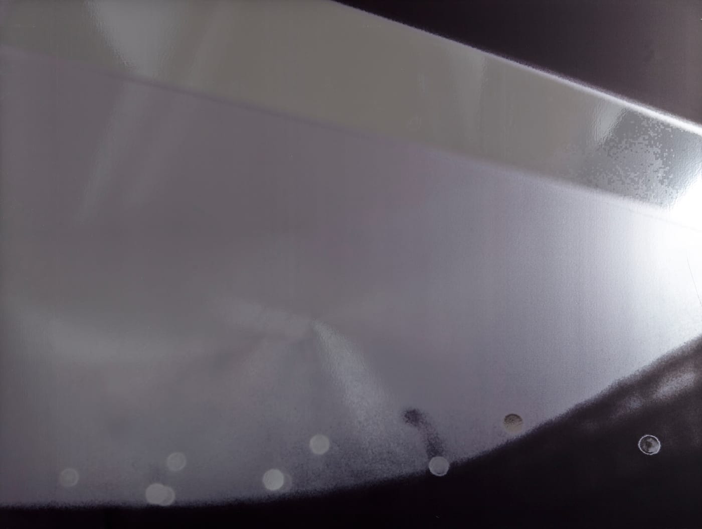 When printed on smooth, aluminum-clad Dibond (or, as in the case of “Car Window 16”, on vinyl mounted to Dibond), the dark tones of the source photo remain shadowy but the mid-tones take on a luminous shimmer and the image merges with its surroundings’ reflection. Where there is no tone at all in the photo— those rare, pure white areas — the substrate reflects like a mirror.