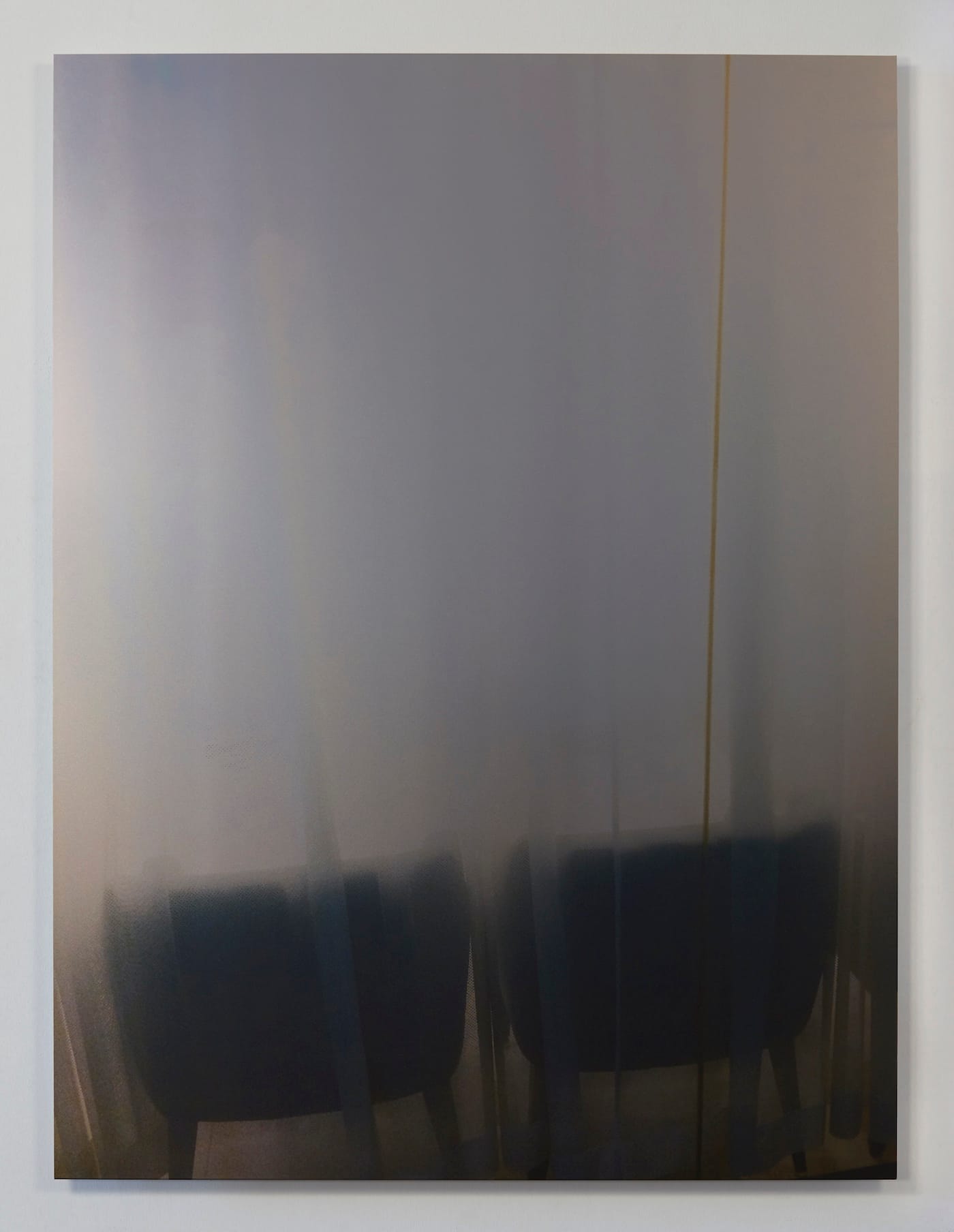 To this family of techniques, Marshall introduces the photographic image. With the theme of motion in full swing, it’s pretty funny that the only work obviously not based on a picture taken from a moving vehicle is “Waiting Room 1” (45 x 33 inches, UV curable ink on mirrored Dibond; 2017), which depicts a place where you’re meant to stay put for a while. Seen from behind, a pair of chairs seems to dematerialize behind a gauzy curtain. Relative perceptual certainty — in this case, of bland, bulky furniture — evanesces into an aura of doubt and unknowability.