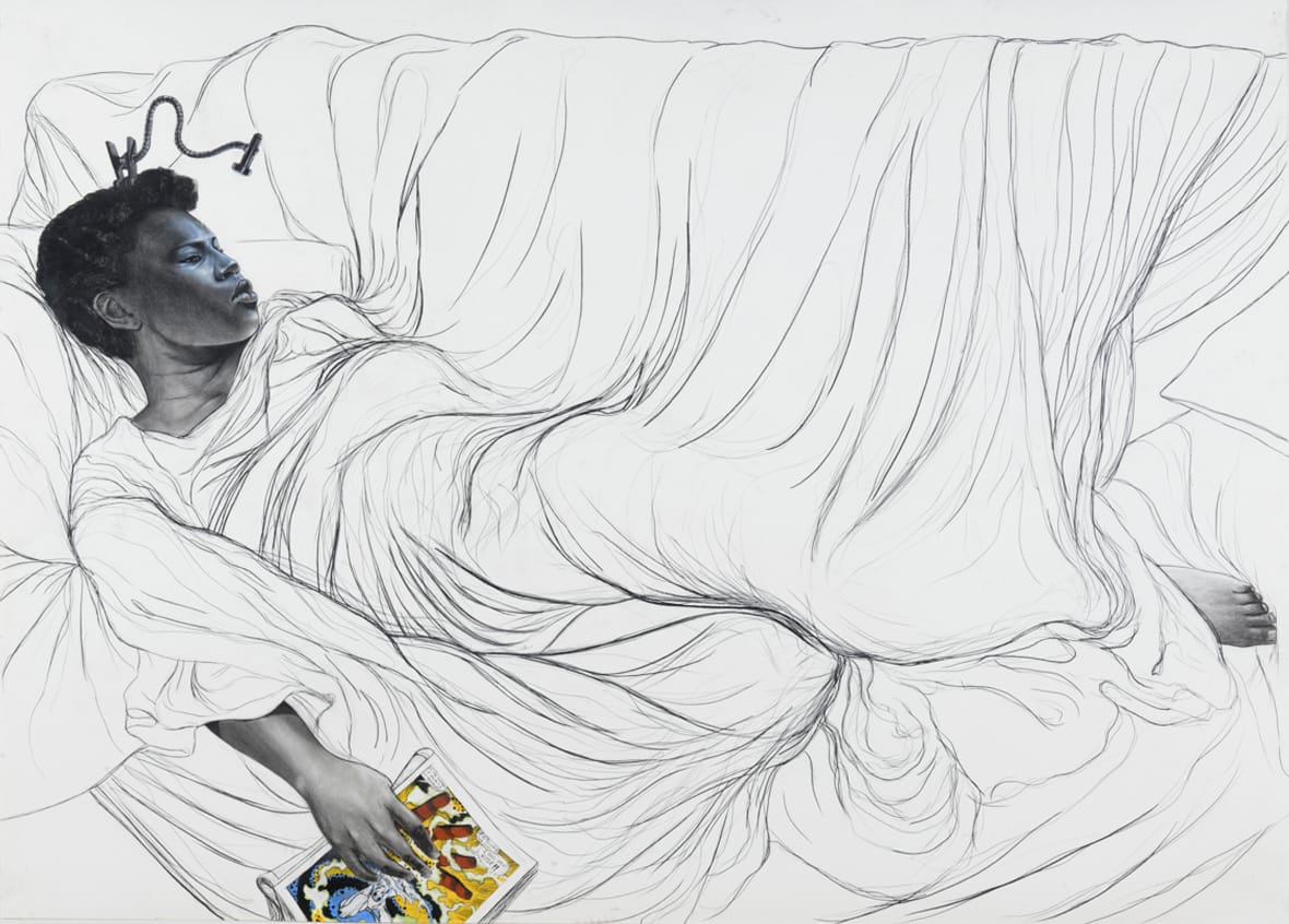“I Turned Myself Into Myself” (2018) is an odd and beguiling drawing. It consists mostly of flowing line, tracing the spill and fold of drapery over a couch and the supine body of a woman lying across its length. The woman’s head is fully rendered, as is her foot and a hand that holds an open comic book showing the Silver Surfer being called to his feet by his creator and enemy, Galactus. Pruitt may have chosen this image because the comic artist Jack Kirby is among his inspirations, or he may sneaking in an allegory, since the Silver Surfer originally served Galactus but eventually found liberty. The word bubbles on the comic’s page show Galactus commanding “I bid you rise!” and the drawing suggests Pruitt wants the woman on the couch to do the same. Her expression is one of serious introspection, the reading light clipped to her hair casts a cold glow around her eyes. The sheet draped over her is a chrysalis, and the feeling is that she will emerge transformed.
