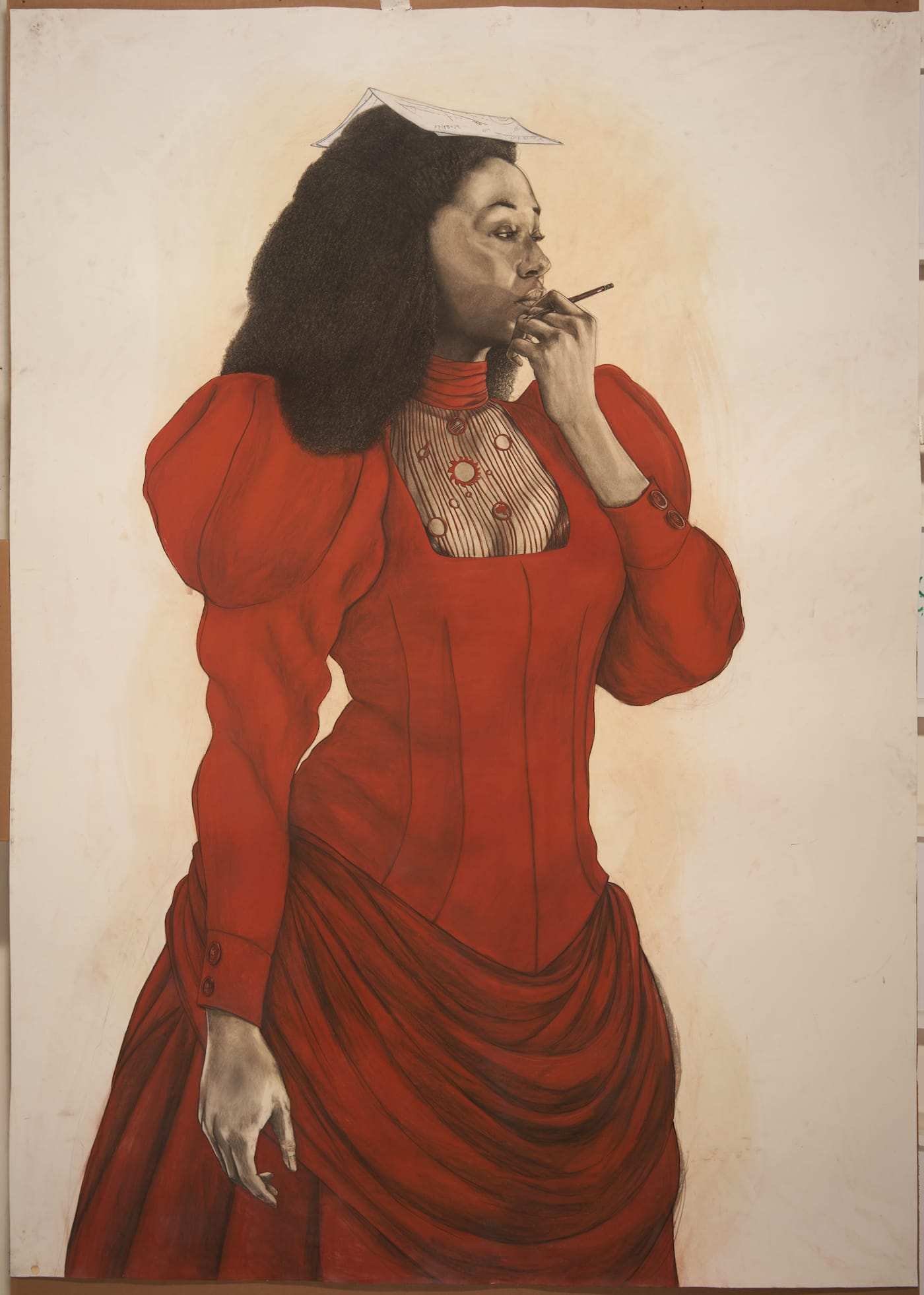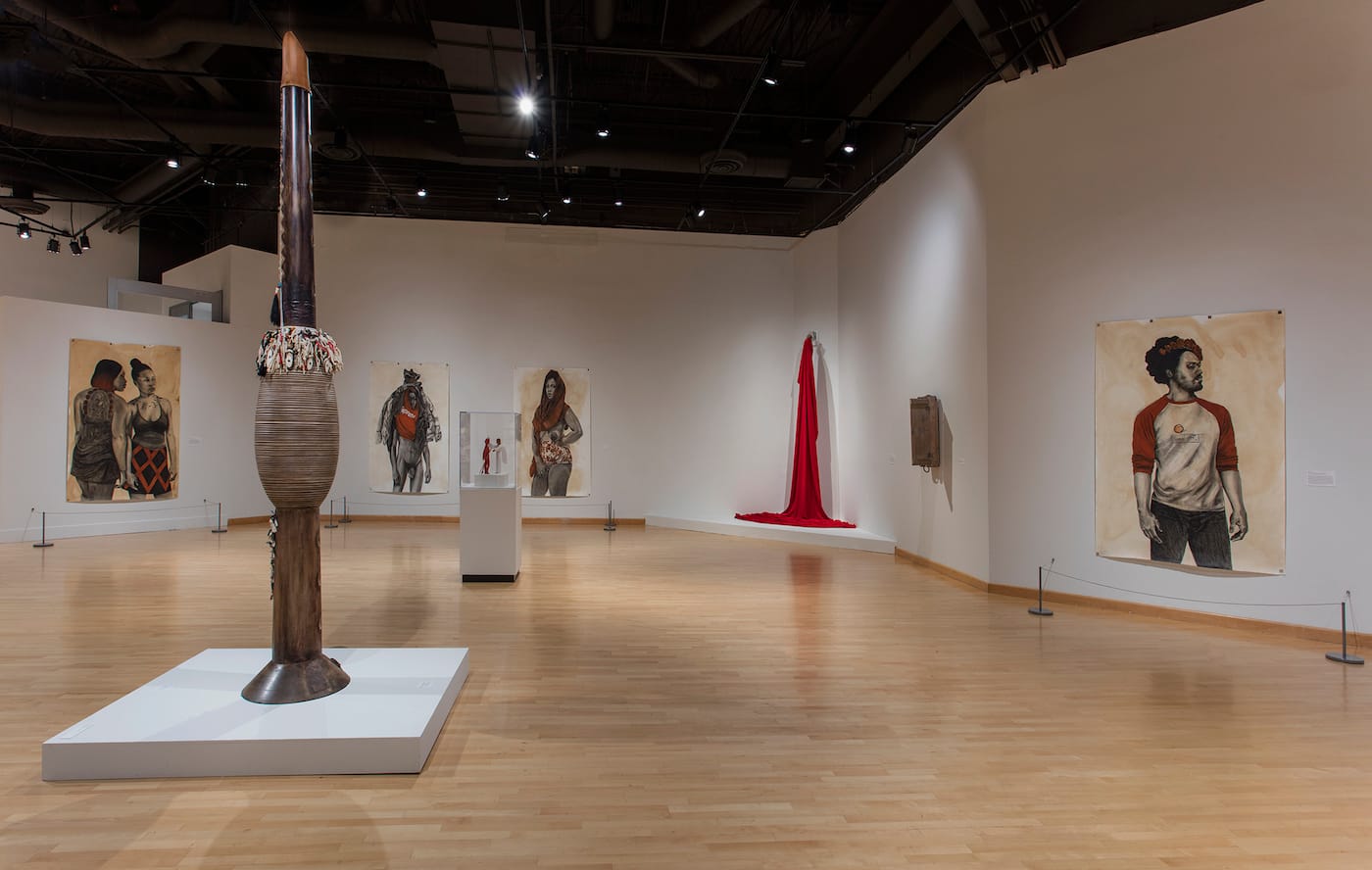 LOS ANGELES — Robert Pruitt is an artist devoted to draftsmanship and in the last several years he has doubled down on his drawing, achieving a new level of mastery. Devotion, a substantial exhibit at the California African American Museum (CAAM) of his large works on paper as well as some sculptures, provides an opportunity to understand the course of his work over the last decade. The show includes objects from CAAM’s permanent collection that speak to some of Pruitt’s interests, including a painting by Robert Thompson and another by Charles White, a Yoruba Gelede Headdress, John Biggers lithographs, and Shirley Chisholm Presidential Campaign buttons.
