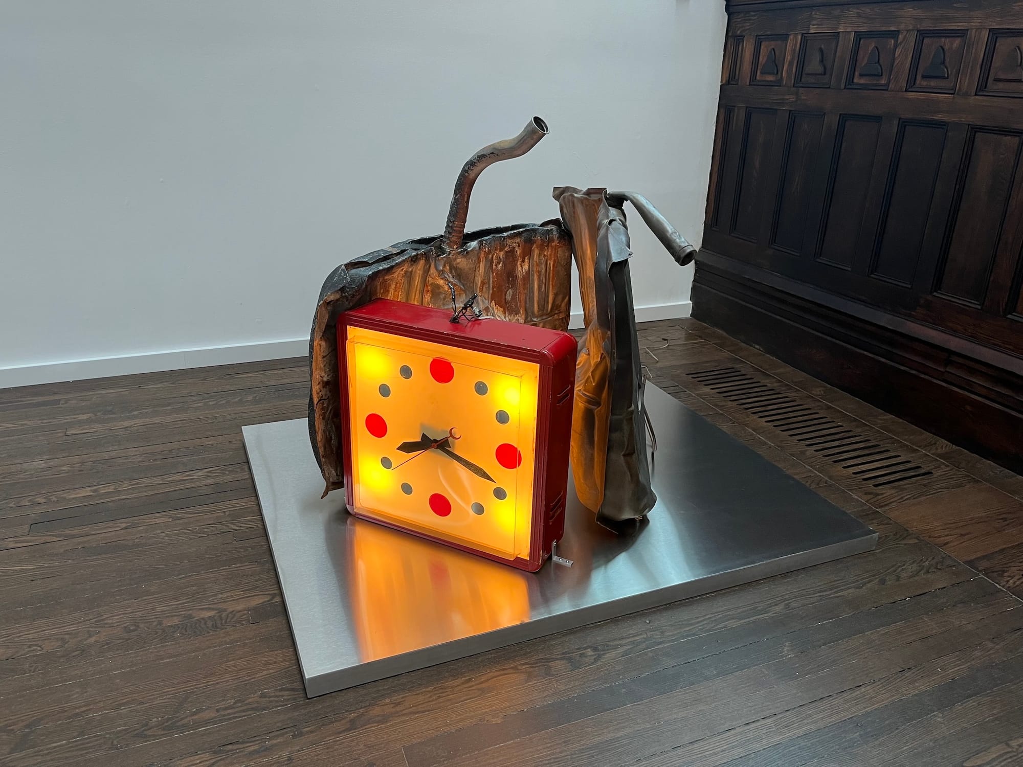 Rauschenberg displayed his own work at 381 Lafayette while he lived there, but now a mix of work fills the exhibition spaces. The 1969 Carnal Clock series stands in a cavernous exhibition space on the first floor. Internal lights brighten the collages, which combine explicit photographs with more eclectic imagery — Rauschenberg's pet turtle, a wok, the head of a buffalo-skin rug.