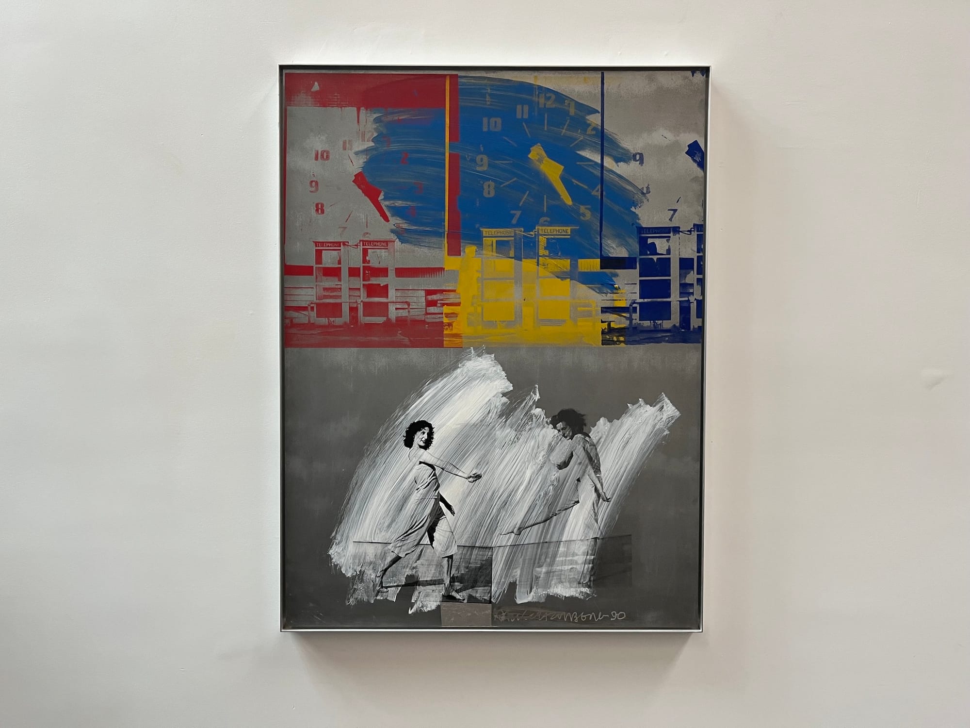 Other sections of the space feature Rauschenberg's sculptures and paintings. In the corner of the chapel, a 1986 sculpture includes a clock and two molded metal gas cans. On a chapel wall, "Same Time Piece (Galvanic Suite)" (1990) again explores the concept of time (a recurrent theme throughout the artist's career). In the painting, two women face each other underneath abstracted clocks. They are clearly in motion, but it's impossible to tell which way they are moving.