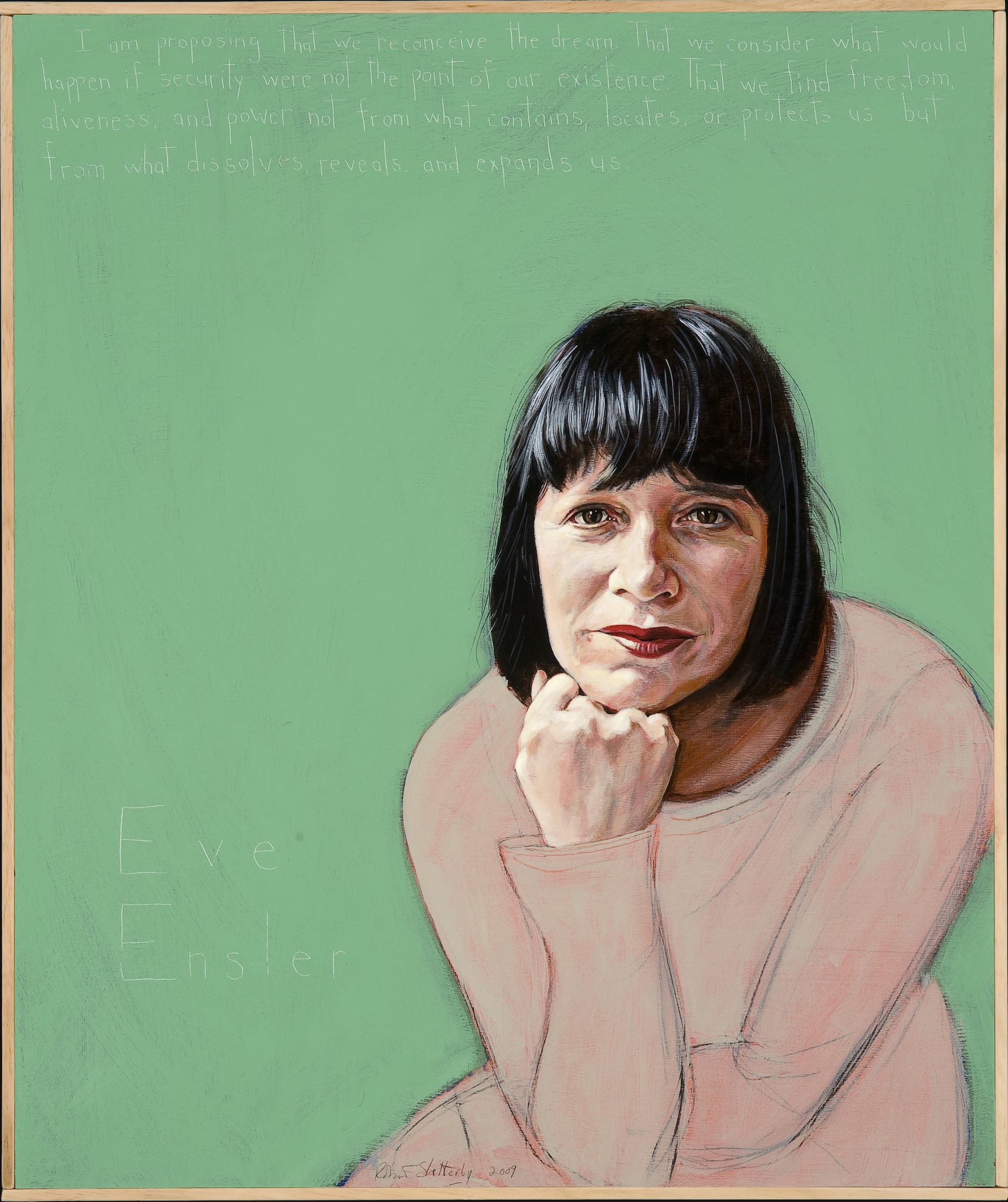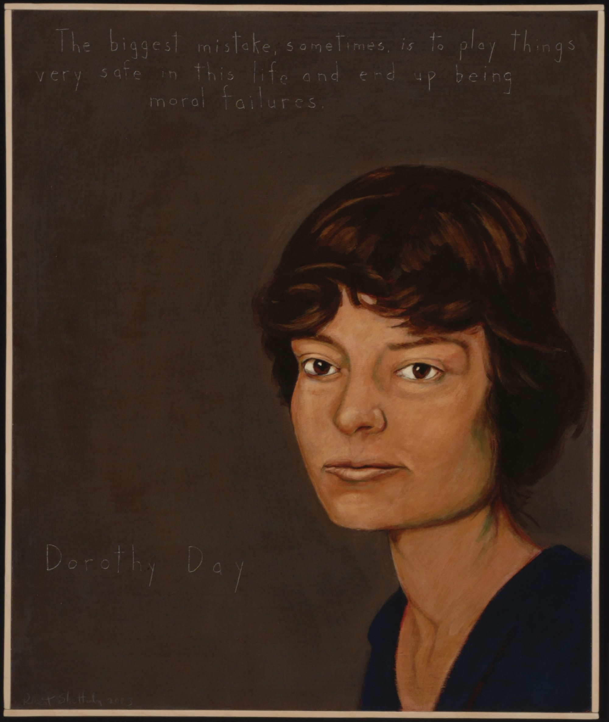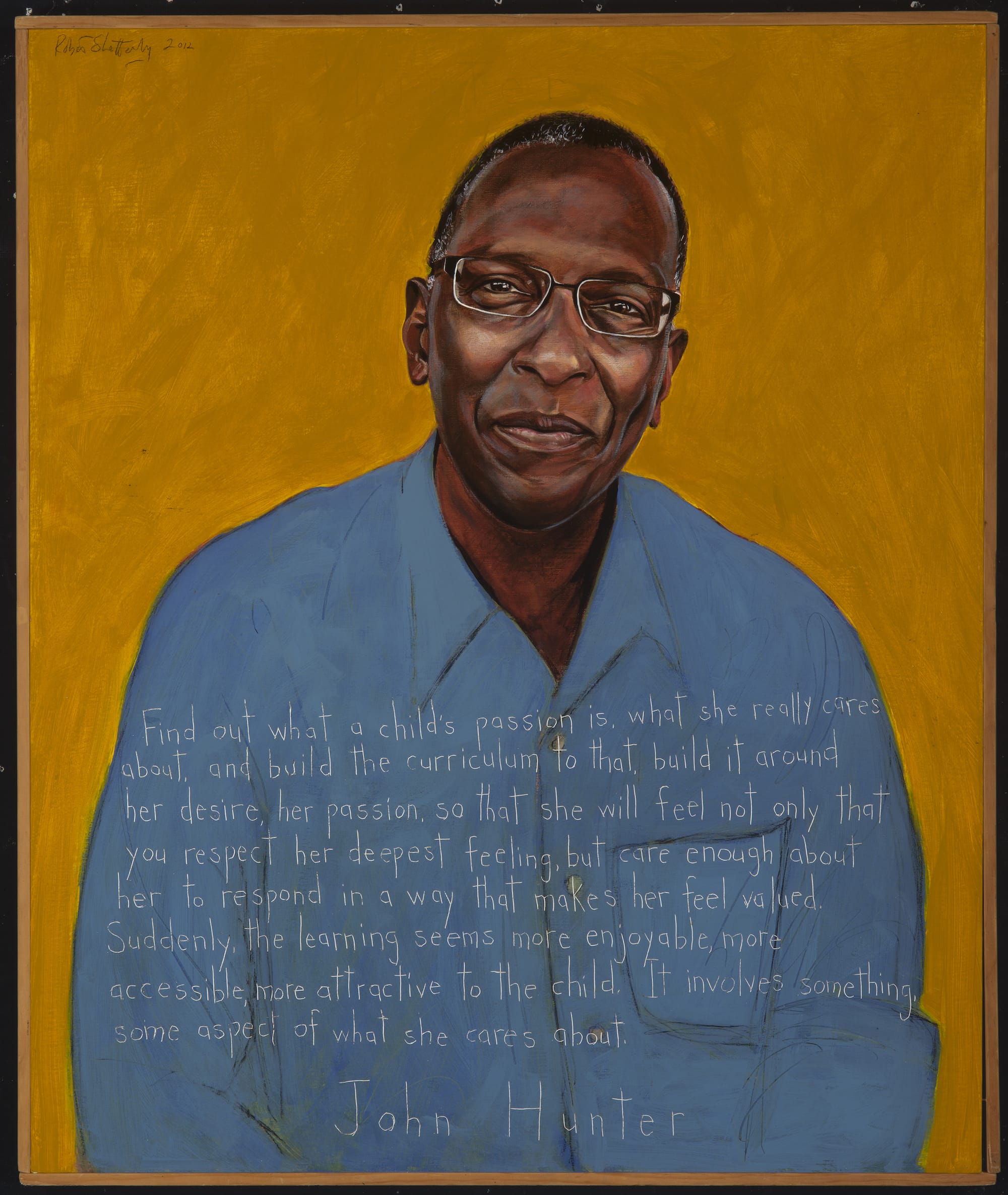 The 36-by-30-inch portraits were each created via an approximately week-long process that involves a combination of brushes, palette knives, fingers, and a dental pick, which Shetterly uses to inscribe subjects’ quotes into the works’ surfaces. But the physical act of painting is just one component of these depictions.