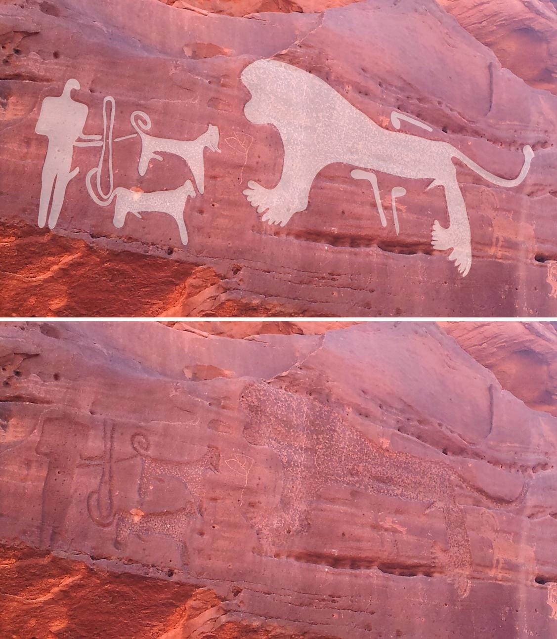A new study of prehistoric rock art reveals how hunters in the Arabian Peninsula pursued prey with dogs over 8,000 years ago — and even controlled their packs with leashes. The engravings represent the earliest evidence for dogs on the Arabian Peninsula and might even stand as the earliest depictions of canines yet, as Science first reported. Found at two sites a few years ago — at a wadi at Shuwaymis and at the desert oasis of Jubbah — the stylized canines predate previous evidence for dogs in the region by over 2,000 years. As for the carved leashes, those simple lines are the earliest known evidence of leads in prehistory.