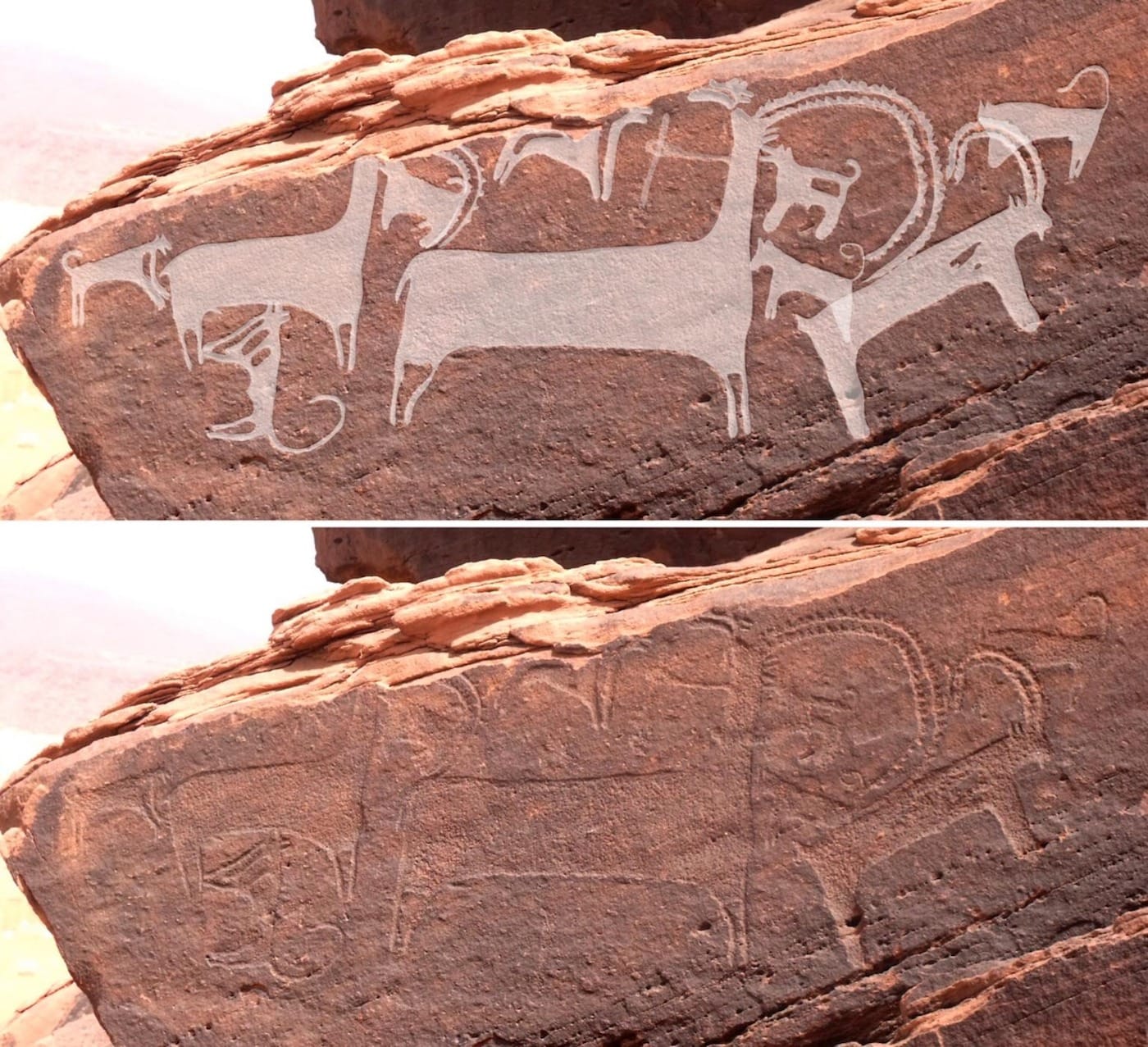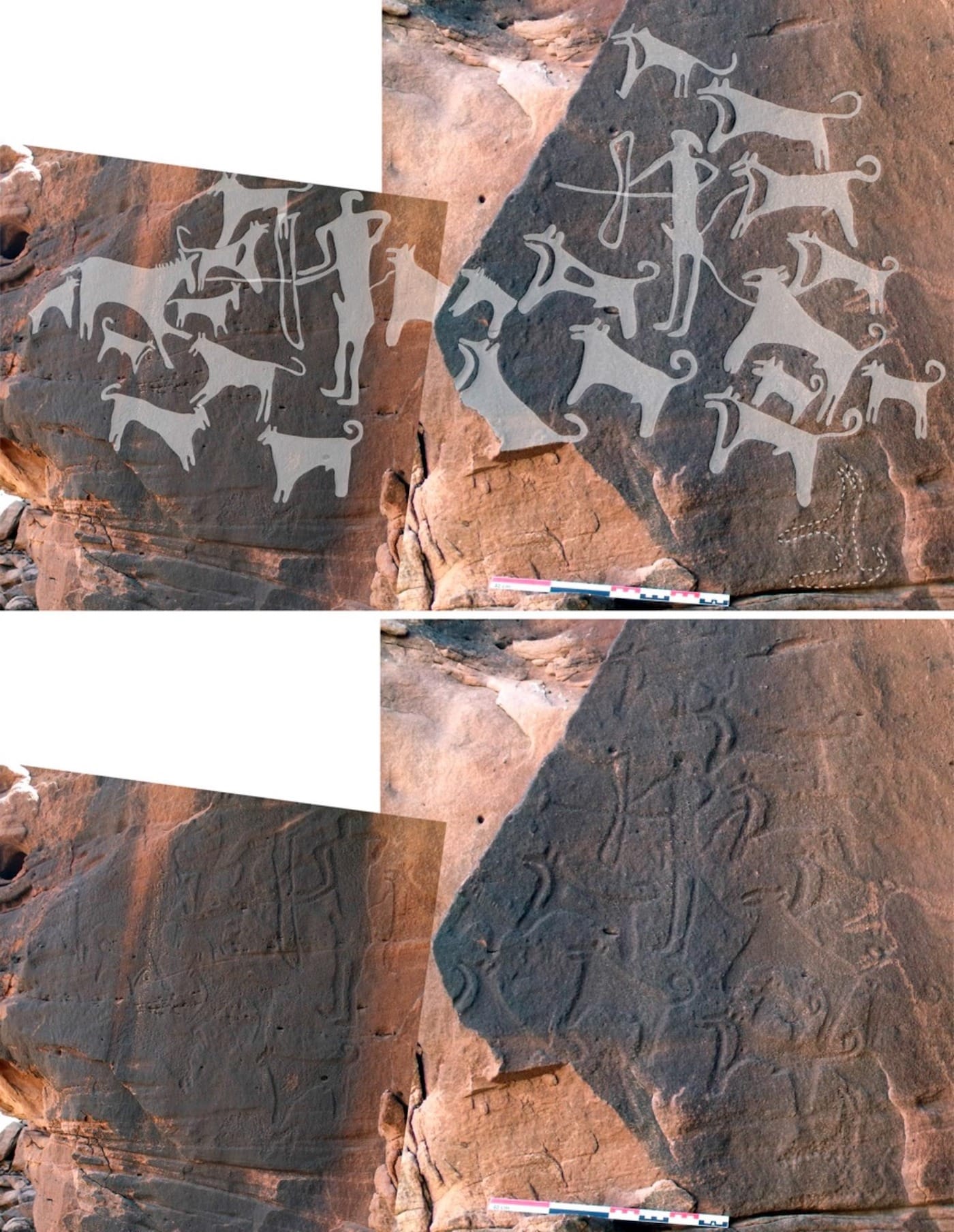 “All of the dogs display characteristic pricked ears, short snouts, deeply-angled chests, and a curled tail, appearing to be of the same ‘type,'” the scientists write, noting that although “the depicted dogs are reminiscent of the modern Canaan dog, it remains unclear if they were brought to the Arabian Peninsula from the Levant or represent an independent domestication of dogs from Arabian wolves.”
